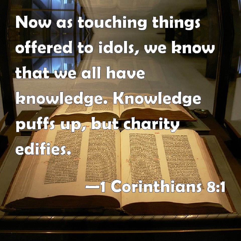 Choose a Background 1 Corinthians 8:1 Now as touching things offered to idols, we know that we all have knowledge. Knowledge puffs up, but charity edifies. KJV: Now as touching things offered unto idols, we know that we all have knowledge. Knowledge puffeth up, but charity edifieth. DRB: NOW concerning those things that are sacrificed to idols, we know that we all have knowledge. Knowledge puffeth up; but charity edifieth. DBT: But concerning things sacrificed to idols, we know, (for we all have knowledge: knowledge puffs up, but love edifies. ERV: Now concerning things sacrificed to idols: We know that we all have knowledge. Knowledge puffeth up, but love edifieth. WBT: Now as concerning things offered to idols, we know that we all have knowledge. Knowledge puffeth up, but charity edifieth. WEB: Now concerning things sacrificed to idols: We know that we all have knowledge. Knowledge puffs up, but love builds up. YLT: And concerning the things sacrificed to idols, we have known that we all have knowledge: knowledge puffeth up, but love buildeth up;Links 1 Corinthians 8:1 NIV • 1 Corinthians 8:1 NLT • 1 Corinthians 8:1 ESV • 1 Corinthians 8:1 NASB • 1 Corinthians 8:1 KJV • 1 Corinthians 8:1 Interlinear • 1 Corinthians 8:1 Commentaries • 1 Corinthians 8:1 Parallel Texts • 1 Corinthians 8:1 Bible Apps • 1 Corinthians 8:1 Parallel • Bible Hub |