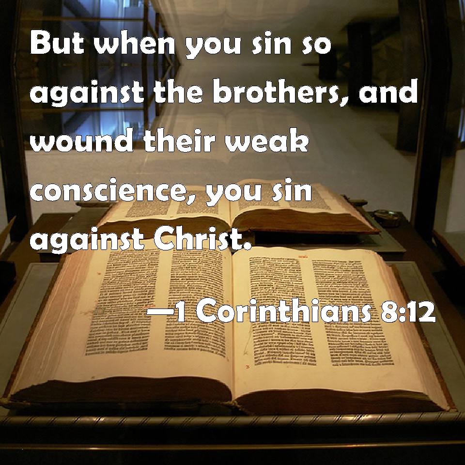 Choose a Background 1 Corinthians 8:12 But when you sin so against the brothers, and wound their weak conscience, you sin against Christ. KJV: But when ye sin so against the brethren, and wound their weak conscience, ye sin against Christ. DRB: Now when you sin thus against the brethren, and wound their weak conscience, you sin against Christ. DBT: Now, thus sinning against the brethren, and wounding their weak conscience, ye sin against Christ. ERV: And thus, sinning against the brethren, and wounding their conscience when it is weak, ye sin against Christ. WBT: But when ye thus sin against the brethren, and wound their weak conscience, ye sin against Christ. WEB: Thus, sinning against the brothers, and wounding their conscience when it is weak, you sin against Christ. YLT: and thus sinning in regard to the brethren, and smiting their weak conscience — in regard to Christ ye sin;Links 1 Corinthians 8:12 NIV • 1 Corinthians 8:12 NLT • 1 Corinthians 8:12 ESV • 1 Corinthians 8:12 NASB • 1 Corinthians 8:12 KJV • 1 Corinthians 8:12 Interlinear • 1 Corinthians 8:12 Commentaries • 1 Corinthians 8:12 Parallel Texts • 1 Corinthians 8:12 Bible Apps • 1 Corinthians 8:12 Parallel • Bible Hub |