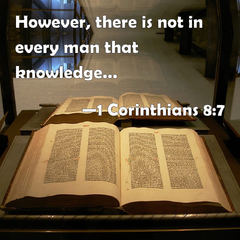 Choose a Background 1 Corinthians 8:7 However, there is not in every man that knowledge: for some with conscience of the idol to this hour eat it as a thing offered to an idol; and their conscience being weak is defiled. KJV: Howbeit there is not in every man that knowledge: for some with conscience of the idol unto this hour eat it as a thing offered unto an idol; and their conscience being weak is defiled. DRB: But there is not knowledge in every one. For some until this present, with conscience of the idol: eat as a thing sacrificed to an idol, and their conscience, being weak, is defiled. DBT: But knowledge is not in all: but some, with conscience of the idol, until now eat as of a thing sacrificed to idols; and their conscience, being weak, is defiled. ERV: Howbeit in all men there is not that knowledge: but some, being used until now to the idol, eat as of a thing sacrificed to an idol; and their conscience being weak is defiled. WBT: But there is not in every man that knowledge: for some with conscience of the idol to this hour eat it as a thing offered to an idol; and their conscience, being weak, is defiled. WEB: However, that knowledge isn't in all men. But some, with consciousness of the idol until now, eat as of a thing sacrificed to an idol, and their conscience, being weak, is defiled. YLT: but not in all men is the knowledge, and certain with conscience of the idol, till now, as a thing sacrificed to an idol do eat it, and their conscience, being weak, is defiled.Links 1 Corinthians 8:7 NIV • 1 Corinthians 8:7 NLT • 1 Corinthians 8:7 ESV • 1 Corinthians 8:7 NASB • 1 Corinthians 8:7 KJV • 1 Corinthians 8:7 Interlinear • 1 Corinthians 8:7 Commentaries • 1 Corinthians 8:7 Parallel Texts • 1 Corinthians 8:7 Bible Apps • 1 Corinthians 8:7 Parallel • Bible Hub |