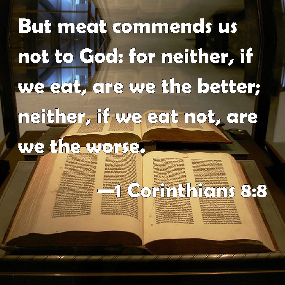 Choose a Background 1 Corinthians 8:8 But meat commends us not to God: for neither, if we eat, are we the better; neither, if we eat not, are we the worse. KJV: But meat commendeth us not to God: for neither, if we eat, are we the better; neither, if we eat not, are we the worse. DRB: But meat doth not commend us to God. For neither, if we eat, shall we have the more; nor, if we eat not, shall we have the less. DBT: But meat does not commend us to God; neither if we should not eat do we come short; nor if we should eat have we an advantage. ERV: But meat will not commend us to God: neither, if we eat not, are we the worse; nor, if we eat, are we the better. WBT: But food commendeth us not to God: for neither if we eat, are we the better; neither if we eat not, are we the worse. WEB: But food will not commend us to God. For neither, if we don't eat, are we the worse; nor, if we eat, are we the better. YLT: But victuals do not commend us to God, for neither if we may eat are we in advance; nor if we may not eat, are we behind;Links 1 Corinthians 8:8 NIV • 1 Corinthians 8:8 NLT • 1 Corinthians 8:8 ESV • 1 Corinthians 8:8 NASB • 1 Corinthians 8:8 KJV • 1 Corinthians 8:8 Interlinear • 1 Corinthians 8:8 Commentaries • 1 Corinthians 8:8 Parallel Texts • 1 Corinthians 8:8 Bible Apps • 1 Corinthians 8:8 Parallel • Bible Hub |