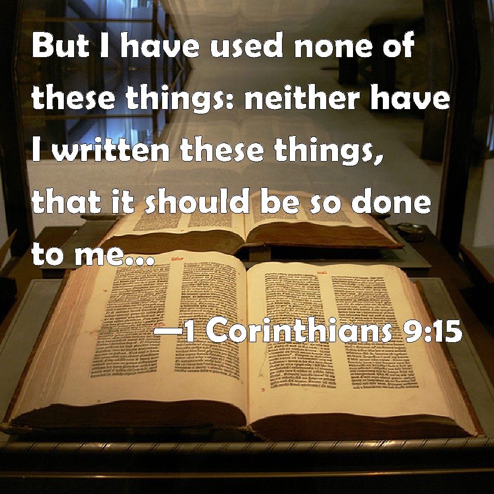 Choose a Background 1 Corinthians 9:15 But I have used none of these things: neither have I written these things, that it should be so done to me: for it were better for me to die, than that any man should make my glorying void. KJV: But I have used none of these things: neither have I written these things, that it should be so done unto me: for it were better for me to die, than that any man should make my glorying void. DRB: But I have used none of these things. Neither have I written these things, that they should be so done unto me: for it is good for me to die, rather than that any man should make my glory void. DBT: But I have used none of these things. Now I have not written these things that it should be thus in my case; for it were good for me rather to die than that any one should make vain my boast. ERV: But I have used none of these things: and I write not these things that it may be so done in my case: for it were good for me rather to die, than that any man should make my glorying void. WBT: But I have used none of these things: neither have I written these things, that it should be so done to me: for it were better for me to die, than that any man should make my glorying void. WEB: But I have used none of these things, and I don't write these things that it may be done so in my case; for I would rather die, than that anyone should make my boasting void. YLT: And I have used none of these things; neither did I write these things that it may be so done in my case, for it is good for me rather to die, than that any one may make my glorying void;Links 1 Corinthians 9:15 NIV • 1 Corinthians 9:15 NLT • 1 Corinthians 9:15 ESV • 1 Corinthians 9:15 NASB • 1 Corinthians 9:15 KJV • 1 Corinthians 9:15 Interlinear • 1 Corinthians 9:15 Commentaries • 1 Corinthians 9:15 Parallel Texts • 1 Corinthians 9:15 Bible Apps • 1 Corinthians 9:15 Parallel • Bible Hub |