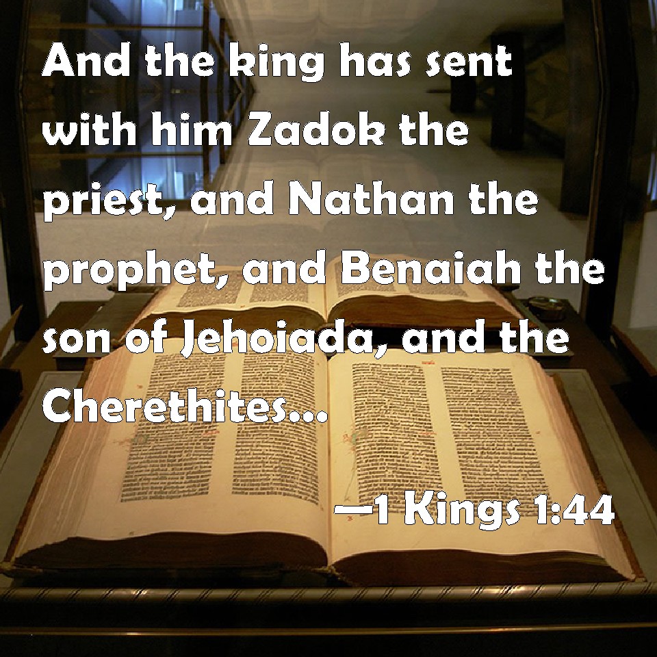 Choose a Background 1 Kings 1:44 And the king has sent with him Zadok the priest, and Nathan the prophet, and Benaiah the son of Jehoiada, and the Cherethites, and the Pelethites, and they have caused him to ride on the king's mule: KJV: And the king hath sent with him Zadok the priest, and Nathan the prophet, and Benaiah the son of Jehoiada, and the Cherethites, and the Pelethites, and they have caused him to ride upon the king's mule: DRB: And hath sent with him Sadoc the priest, and Nathan the prophet, and Banaias the son of Joiada, and the Cerethi, and Phelethi, and they have set him upon the king's mule. DBT: And the king has sent with him Zadok the priest, and Nathan the prophet, and Benaiah the son of Jehoiada, and the Cherethites and the Pelethites, and they have caused him to ride upon the king's mule; ERV: and the king hath sent with him Zadok the priest, and Nathan the prophet, and Benaiah the son of Jehoiada, and the Cherethites and the Pelethites, and they have caused him to ride upon the king's mule: WBT: And the king hath sent with him Zadok the priest, and Nathan the prophet, and Benaiah the son of Jehoiada, and the Cherethites, and the Pelethites, and they have caused him to ride upon the king's mule: WEB: The king has sent with him Zadok the priest, Nathan the prophet, Benaiah the son of Jehoiada, and the Cherethites and the Pelethites; and they have caused him to ride on the king's mule. YLT: and the king sendeth with him Zadok the priest, and Nathan the prophet, and Benaiah son of Jehoiada, and the Cherethite, and the Pelethite, and they cause him to ride on the king's mule,Links 1 Kings 1:44 NIV • 1 Kings 1:44 NLT • 1 Kings 1:44 ESV • 1 Kings 1:44 NASB • 1 Kings 1:44 KJV • 1 Kings 1:44 Interlinear • 1 Kings 1:44 Commentaries • 1 Kings 1:44 Parallel Texts • 1 Kings 1:44 Bible Apps • 1 Kings 1:44 Parallel • Bible Hub |