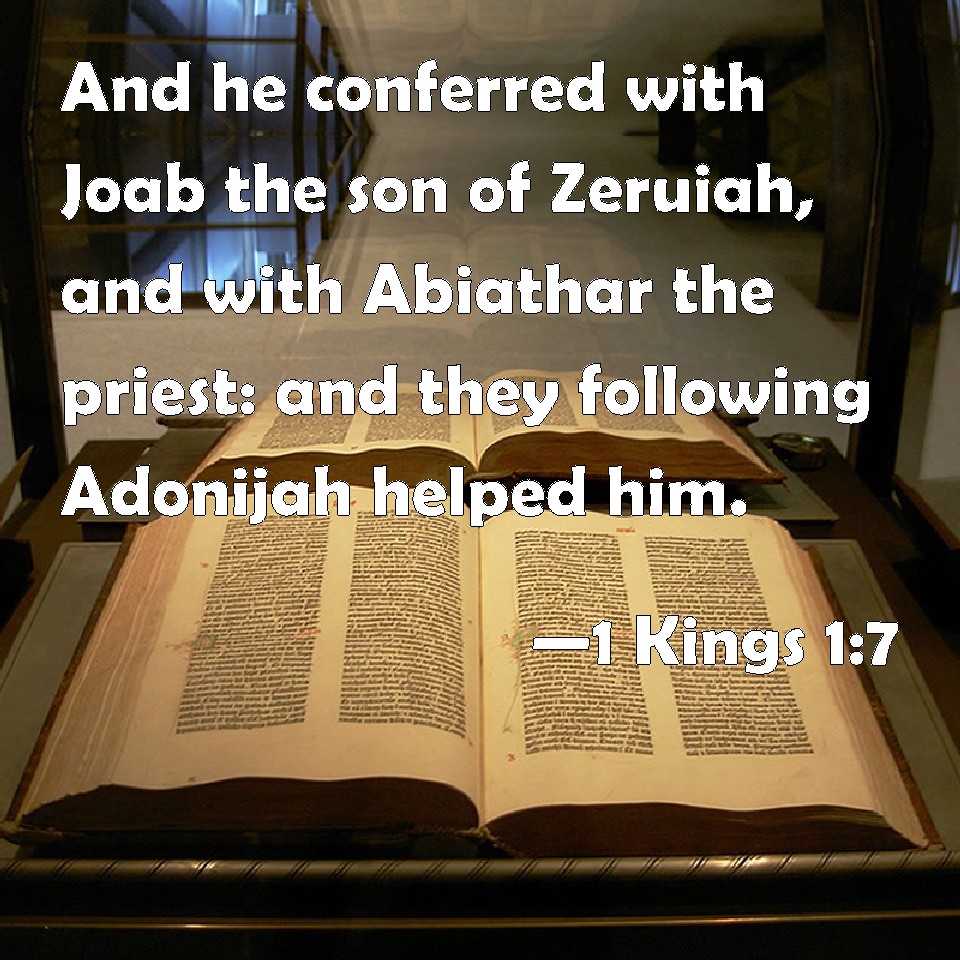 Choose a Background 1 Kings 1:7 And he conferred with Joab the son of Zeruiah, and with Abiathar the priest: and they following Adonijah helped him. KJV: And he conferred with Joab the son of Zeruiah, and with Abiathar the priest: and they following Adonijah helped him. DRB: And he conferred with Joab the son of Sarvia, and with Abiathar the priest, who furthered Adonias's side. DBT: And he conferred with Joab the son of Zeruiah, and with Abiathar the priest; and they helped Adonijah and followed him. ERV: And he conferred with Joab the son of Zeruiah, and with Abiathar the priest: and they following Adonijah helped him. WBT: And he conferred with Joab the son of Zeruiah, and with Abiathar the priest: and they following Adonijah, helped him. WEB: He conferred with Joab the son of Zeruiah, and with Abiathar the priest: and they following Adonijah helped him. YLT: And his words are with Joab son of Zeruiah, and with Abiathar the priest, and they help after Adonijah;Links 1 Kings 1:7 NIV • 1 Kings 1:7 NLT • 1 Kings 1:7 ESV • 1 Kings 1:7 NASB • 1 Kings 1:7 KJV • 1 Kings 1:7 Interlinear • 1 Kings 1:7 Commentaries • 1 Kings 1:7 Parallel Texts • 1 Kings 1:7 Bible Apps • 1 Kings 1:7 Parallel • Bible Hub |