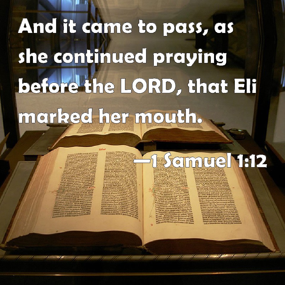 Choose a Background 1 Samuel 1:12 And it came to pass, as she continued praying before the LORD, that Eli marked her mouth. KJV: And it came to pass, as she continued praying before the LORD, that Eli marked her mouth. DRB: And it came to pass, as she multiplied prayers before the Lord, that Heli observed her mouth. DBT: And it came to pass as she continued praying before Jehovah, that Eli marked her mouth. ERV: And it came to pass, as she continued praying before the LORD, that Eli marked her mouth. WBT: And it came to pass, as she continued praying before the LORD, that Eli observed her mouth. WEB: It happened, as she continued praying before Yahweh, that Eli saw her mouth. YLT: And it hath been, when she multiplied praying before Jehovah, that Eli is watching her mouth,Links 1 Samuel 1:12 NIV • 1 Samuel 1:12 NLT • 1 Samuel 1:12 ESV • 1 Samuel 1:12 NASB • 1 Samuel 1:12 KJV • 1 Samuel 1:12 Interlinear • 1 Samuel 1:12 Commentaries • 1 Samuel 1:12 Parallel Texts • 1 Samuel 1:12 Bible Apps • 1 Samuel 1:12 Parallel • Bible Hub |