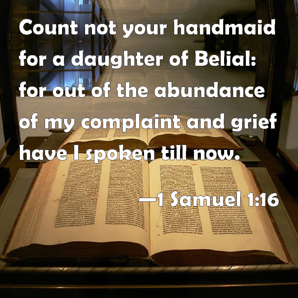 1 Samuel 1:16 Count not your handmaid for a daughter of Belial: for out of the abundance of my complaint and grief have I spoken till now.