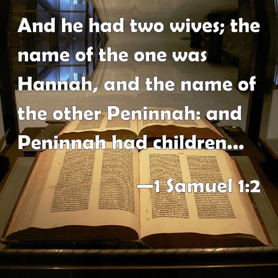 Choose a Background 1 Samuel 1:2 And he had two wives; the name of the one was Hannah, and the name of the other Peninnah: and Peninnah had children, but Hannah had no children. KJV: And he had two wives; the name of the one was Hannah, and the name of the other Peninnah: and Peninnah had children, but Hannah had no children. DRB: And he had two wives, the name of one was Anna, and the name of the other Phenenna. Phenenna had children: but Anna had no children. DBT: And he had two wives: the name of the one was Hannah, and the name of the other Peninnah; and Peninnah had children, but Hannah had no children. ERV: and he had two wives; the name of the one was Hannah, and the name of the other Peninnah: and Peninnah had children, but Hannah had no children. WBT: And he had two wives; the name of the one was Hannah, and the name of the other Peninnah: and Peninnah had children, but Hannah had no children. WEB: and he had two wives; the name of the one was Hannah, and the name of other Peninnah: and Peninnah had children, but Hannah had no children. YLT: and he hath two wives, the name of the one is Hannah, and the name of the second Peninnah, and Peninnah hath children, and Hannah hath no children.Links 1 Samuel 1:2 NIV • 1 Samuel 1:2 NLT • 1 Samuel 1:2 ESV • 1 Samuel 1:2 NASB • 1 Samuel 1:2 KJV • 1 Samuel 1:2 Interlinear • 1 Samuel 1:2 Commentaries • 1 Samuel 1:2 Parallel Texts • 1 Samuel 1:2 Bible Apps • 1 Samuel 1:2 Parallel • Bible Hub |