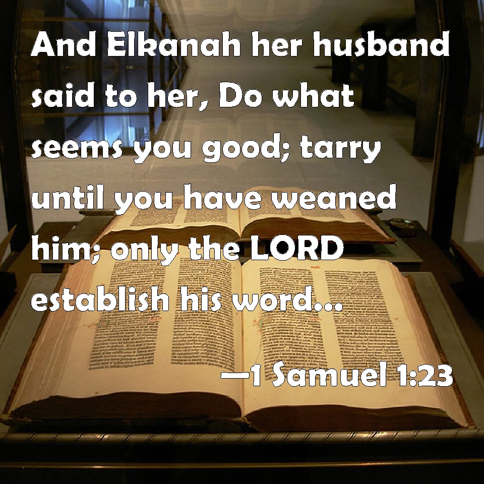 Choose a Background 1 Samuel 1:23 And Elkanah her husband said to her, Do what seems you good; tarry until you have weaned him; only the LORD establish his word. So the woman stayed, and gave her son suck until she weaned him. KJV: And Elkanah her husband said unto her, Do what seemeth thee good; tarry until thou have weaned him; only the LORD establish his word. So the woman abode, and gave her son suck until she weaned him. DRB: And Elcana her husband said to her: Do what seemeth good to thee, and stay till thou wean him: and I pray that the Lord may fulfil his word. So the woman stayed at home, and gave her son suck, till she weaned him. DBT: And Elkanah her husband said to her, Do what is good in thy sight: abide until thou hast weaned him; only, may Jehovah fulfil his word. And the woman abode, and gave her son suck until she weaned him. ERV: And Elkanah her husband said unto her, Do what seemeth thee good; tarry until thou have weaned him; only the LORD establish his word. So the woman tarried and gave her son suck, until she weaned him. WBT: And Elkanah her husband said to her, Do what seemeth to thee good; tarry until thou hast weaned him; only the LORD establish his word. So the woman abode, and nursed her son until she weaned him. WEB: Elkanah her husband said to her, "Do what seems good to you. Wait until you have weaned him; only may Yahweh establish his word." So the woman waited and nursed her son, until she weaned him. YLT: And Elkanah her husband saith to her, 'Do that which is good in thine eyes; abide till thy weaning him; only, Jehovah establish His word;' and the woman abideth and suckleth her son till she hath weaned him,Links 1 Samuel 1:23 NIV • 1 Samuel 1:23 NLT • 1 Samuel 1:23 ESV • 1 Samuel 1:23 NASB • 1 Samuel 1:23 KJV • 1 Samuel 1:23 Interlinear • 1 Samuel 1:23 Commentaries • 1 Samuel 1:23 Parallel Texts • 1 Samuel 1:23 Bible Apps • 1 Samuel 1:23 Parallel • Bible Hub |
