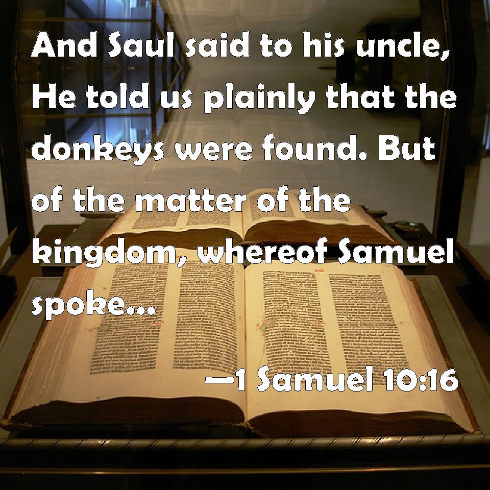 Choose a Background 1 Samuel 10:16 And Saul said to his uncle, He told us plainly that the asses were found. But of the matter of the kingdom, whereof Samuel spoke, he told him not. KJV: And Saul said unto his uncle, He told us plainly that the asses were found. But of the matter of the kingdom, whereof Samuel spake, he told him not. DRB: And Saul said to his uncle: He told us that the asses were found. But of the matter of the kingdom of which Samuel had spoken to him, he told him not. DBT: And Saul said to his uncle, He told us for certain that the asses were found. But of the matter of the kingdom, of which Samuel had spoken, he told him not. ERV: And Saul said unto his uncle, He told us plainly that the asses were found. But concerning the matter of the kingdom, whereof Samuel spake, he told him not. WBT: And Saul said to his uncle, He told us plainly that the asses were found. But of the matter of the kingdom, of which Samuel spoke, he told him not. WEB: Saul said to his uncle, "He told us plainly that the donkeys were found." But concerning the matter of the kingdom, of which Samuel spoke, he didn't tell him. YLT: And Saul saith unto his uncle, 'He certainly declared to us that the asses were found;' and of the matter of the kingdom he hath not declared to him that which Samuel said.Links 1 Samuel 10:16 NIV • 1 Samuel 10:16 NLT • 1 Samuel 10:16 ESV • 1 Samuel 10:16 NASB • 1 Samuel 10:16 KJV • 1 Samuel 10:16 Interlinear • 1 Samuel 10:16 Commentaries • 1 Samuel 10:16 Parallel Texts • 1 Samuel 10:16 Bible Apps • 1 Samuel 10:16 Parallel • Bible Hub |