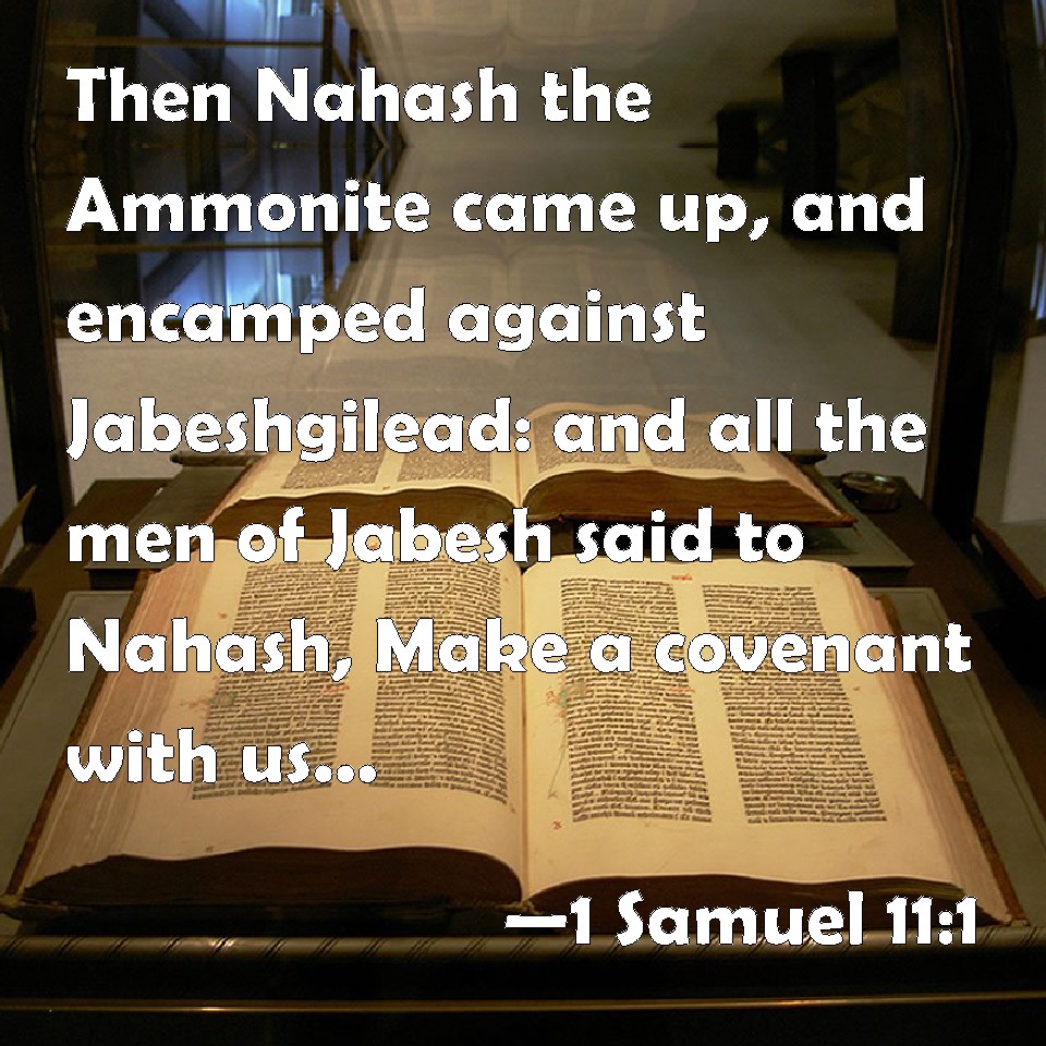 Choose a Background 1 Samuel 11:1 Then Nahash the Ammonite came up, and encamped against Jabeshgilead: and all the men of Jabesh said to Nahash, Make a covenant with us, and we will serve you. KJV: Then Nahash the Ammonite came up, and encamped against Jabeshgilead: and all the men of Jabesh said unto Nahash, Make a covenant with us, and we will serve thee. DRB: And it came to pass about a month after this that Naas, the Ammonite came up, and began to fight against Jabes Galaad. And all the men of Jabes said to Naas: Make a covenant with us, and we will serve thee. DBT: And Nahash the Ammonite came up and encamped against Jabesh-Gilead. And all the men of Jabesh said to Nahash, Make a covenant with us, and we will serve thee. ERV: Then Nahash the Ammonite came up, and encamped against Jabesh-gilead: and all the men of Jabesh said unto Nahash, Make a covenant with us, and we will serve thee. WBT: Then Nahash the Ammonite came up, and encamped against Jabesh-gilead: and all the men of Jabesh said to Nahash, Make a covenant with us, and we will serve thee. WEB: Then Nahash the Ammonite came up, and encamped against Jabesh Gilead: and all the men of Jabesh said to Nahash, "Make a covenant with us, and we will serve you." YLT: And Nahash the Ammonite cometh up, and encampeth against Jabesh-Gilead, and all the men of Jabesh say unto Nahash, 'Make with us a covenant, and we serve thee.'Links 1 Samuel 11:1 NIV • 1 Samuel 11:1 NLT • 1 Samuel 11:1 ESV • 1 Samuel 11:1 NASB • 1 Samuel 11:1 KJV • 1 Samuel 11:1 Interlinear • 1 Samuel 11:1 Commentaries • 1 Samuel 11:1 Parallel Texts • 1 Samuel 11:1 Bible Apps • 1 Samuel 11:1 Parallel • Bible Hub |