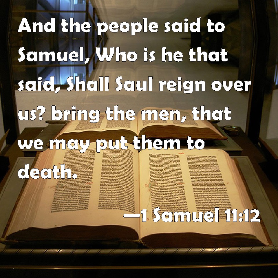 Choose a Background 1 Samuel 11:12 And the people said to Samuel, Who is he that said, Shall Saul reign over us? bring the men, that we may put them to death. KJV: And the people said unto Samuel, Who is he that said, Shall Saul reign over us? bring the men, that we may put them to death. DRB: And the people said to Samuel: Who is he that said: Shall Saul reign over us? Bring the men and we will kill them. DBT: And the people said to Samuel, Who is he that said, Shall Saul reign over us? bring the men, that we may put them to death. ERV: And the people said unto Samuel, Who is he that said, Shall Saul reign over us? bring the men, that we may put them to death. WBT: And the people said to Samuel, Who is he that said, Shall Saul reign over us? bring the men, that we may put them to death. WEB: The people said to Samuel, "Who is he who said, 'Shall Saul reign over us?' Bring those men, that we may put them to death!" YLT: And the people say unto Samuel, 'Who is he that saith, Saul doth reign over us! give ye up the men, and we put them to death.'Links 1 Samuel 11:12 NIV • 1 Samuel 11:12 NLT • 1 Samuel 11:12 ESV • 1 Samuel 11:12 NASB • 1 Samuel 11:12 KJV • 1 Samuel 11:12 Interlinear • 1 Samuel 11:12 Commentaries • 1 Samuel 11:12 Parallel Texts • 1 Samuel 11:12 Bible Apps • 1 Samuel 11:12 Parallel • Bible Hub |