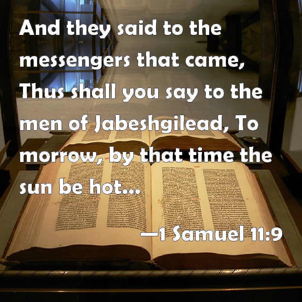 Choose a Background 1 Samuel 11:9 And they said to the messengers that came, Thus shall you say to the men of Jabeshgilead, To morrow, by that time the sun be hot, you shall have help. And the messengers came and showed it to the men of Jabesh; and they were glad. KJV: And they said unto the messengers that came, Thus shall ye say unto the men of Jabeshgilead, To morrow, by that time the sun be hot, ye shall have help. And the messengers came and shewed it to the men of Jabesh; and they were glad. DRB: And they said to the messengers that came: Thus shall you say to the men of Jabes Galaad: To morrow, when the sun shall be hot, you shall have relief. The messengers therefore came, and told the men of Jabes: and they were glad. DBT: And they said to the messengers that had come, Thus shall ye say to the men of Jabesh-Gilead: To-morrow ye shall have deliverance when the sun is hot. And the messengers came and informed the men of Jabesh-Gilead; and they were glad. ERV: And they said unto the messengers that came, Thus shall ye say unto the men of Jabesh-gilead, Tomorrow, by the time the sun is hot, ye shall have deliverance. And the messengers came and told the men of Jabesh; and they were glad. WBT: And they said to the messengers that came, thus shall ye say to the men of Jabesh-gilead, To-morrow by the time the sun is hot, ye shall have help. And the messengers came and showed it to the men of Jabesh; and they were glad. WEB: They said to the messengers who came, "Thus you shall tell the men of Jabesh Gilead, 'Tomorrow, by the time the sun is hot, you shall have deliverance.'" The messengers came and told the men of Jabesh; and they were glad. YLT: And they say to the messengers who are coming, 'Thus do ye say to the men of Jabesh-Gilead: To-morrow ye have safety — by the heat of the sun;' and the messengers come and declare to the men of Jabesh, and they rejoice;Links 1 Samuel 11:9 NIV • 1 Samuel 11:9 NLT • 1 Samuel 11:9 ESV • 1 Samuel 11:9 NASB • 1 Samuel 11:9 KJV • 1 Samuel 11:9 Interlinear • 1 Samuel 11:9 Commentaries • 1 Samuel 11:9 Parallel Texts • 1 Samuel 11:9 Bible Apps • 1 Samuel 11:9 Parallel • Bible Hub |