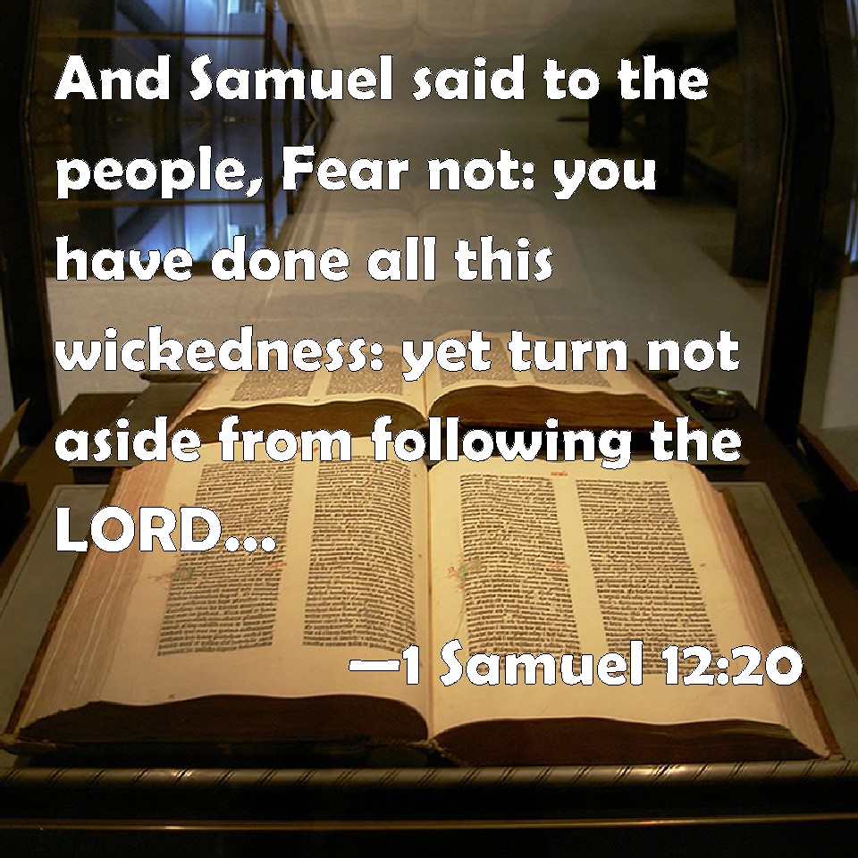 Choose a Background 1 Samuel 12:20 And Samuel said to the people, Fear not: you have done all this wickedness: yet turn not aside from following the LORD, but serve the LORD with all your heart; KJV: And Samuel said unto the people, Fear not: ye have done all this wickedness: yet turn not aside from following the LORD, but serve the LORD with all your heart; DRB: And Samuel said to the people: Fear not, you have done all this evil: but yet depart not from following the Lord, but serve the Lord with all your heart. DBT: And Samuel said to the people, Fear not: ye have done all this wickedness; yet turn not aside from following Jehovah, and serve Jehovah with all your heart; ERV: And Samuel said unto the people, Fear not: ye have indeed done all this evil: yet turn not aside from following the LORD, but serve the LORD with all your heart; WBT: And Samuel said to the people, Fear not: ye have done all this wickedness: yet turn not aside from following the LORD, but serve the LORD with all your heart; WEB: Samuel said to the people, "Don't be afraid. You have indeed done all this evil; yet don't turn aside from following Yahweh, but serve Yahweh with all your heart. YLT: And Samuel saith unto the people, 'Fear not; ye have done all this evil; only, turn not aside from after Jehovah — and ye have served Jehovah with all your heart,Links 1 Samuel 12:20 NIV • 1 Samuel 12:20 NLT • 1 Samuel 12:20 ESV • 1 Samuel 12:20 NASB • 1 Samuel 12:20 KJV • 1 Samuel 12:20 Interlinear • 1 Samuel 12:20 Commentaries • 1 Samuel 12:20 Parallel Texts • 1 Samuel 12:20 Bible Apps • 1 Samuel 12:20 Parallel • Bible Hub |