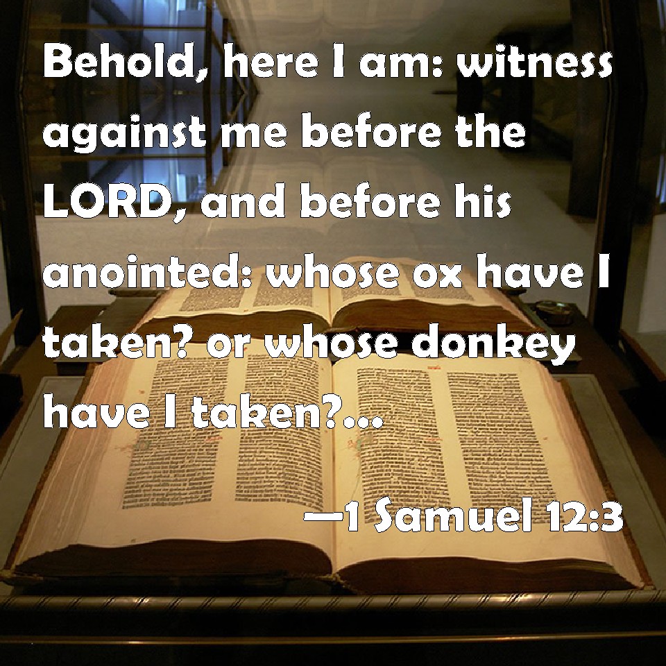 Here I am: witness against me before the LORD, and before his anointed: whose ox have I taken? or whose ass have I taken? or whom have I defrauded? whom have I oppressed? or of whose hand have I taken a ransom to blind mine eyes therewith? and I will restore it you.