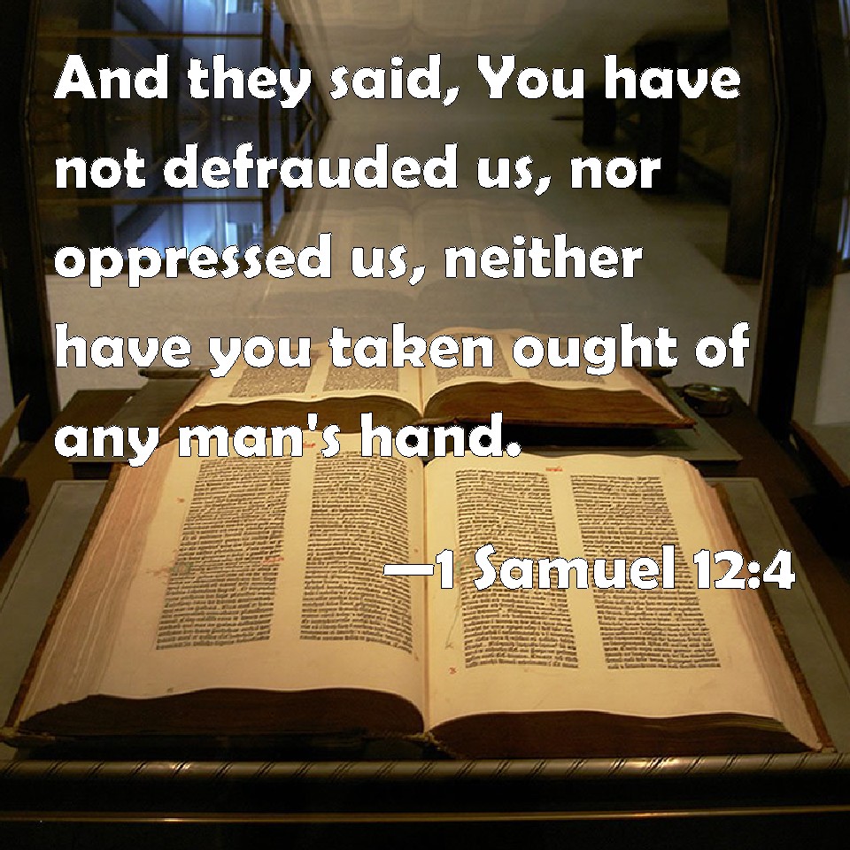 Choose a Background 1 Samuel 12:4 And they said, You have not defrauded us, nor oppressed us, neither have you taken ought of any man's hand. KJV: And they said, Thou hast not defrauded us, nor oppressed us, neither hast thou taken ought of any man's hand. DRB: And they said: Thou hast not wronged us, nor oppressed us, nor taken ought at any man's hand. DBT: And they said, Thou hast not defrauded us, and thou hast not injured us, neither hast thou taken aught of any man's hand. ERV: And they said, Thou hast not defrauded us, nor oppressed us, neither hast thou taken aught of any man's hand. WBT: And they said thou hast not defrauded us, nor oppressed us, neither hast thou taken aught from any man's hand. WEB: They said, "You have not defrauded us, nor oppressed us, neither have you taken anything of any man's hand." YLT: And they say, 'Thou hast not oppressed us, nor hast thou crushed us, nor hast thou taken from the hand of any one anything.'Links 1 Samuel 12:4 NIV • 1 Samuel 12:4 NLT • 1 Samuel 12:4 ESV • 1 Samuel 12:4 NASB • 1 Samuel 12:4 KJV • 1 Samuel 12:4 Interlinear • 1 Samuel 12:4 Commentaries • 1 Samuel 12:4 Parallel Texts • 1 Samuel 12:4 Bible Apps • 1 Samuel 12:4 Parallel • Bible Hub |