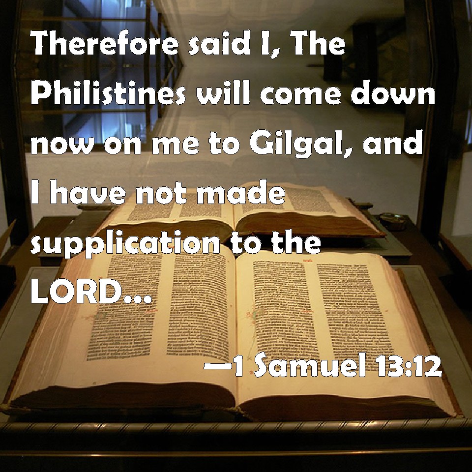 Choose a Background 1 Samuel 13:12 Therefore said I, The Philistines will come down now on me to Gilgal, and I have not made supplication to the LORD: I forced myself therefore, and offered a burnt offering. KJV: Therefore said I, The Philistines will come down now upon me to Gilgal, and I have not made supplication unto the LORD: I forced myself therefore, and offered a burnt offering. DRB: I said: Now will the Philistines come down upon me to Galgal, and I have not appeased the face of the Lord. Forced by necessity, I offered the holocaust. DBT: I said, The Philistines will come down now upon me to Gilgal, and I have not made supplication to Jehovah; and I forced myself, and offered up the burnt-offering. ERV: therefore said I, Now will the Philistines come down upon me to Gilgal, and I have not entreated the favour of the LORD: I forced myself therefore, and offered the burnt offering. WBT: Therefore said I, the Philistines will now come down upon me to Gilgal, and I have not made supplication to the LORD; I forced myself therefore, and offered a burnt-offering. WEB: therefore I said, 'Now the Philistines will come down on me to Gilgal, and I haven't entreated the favor of Yahweh.' I forced myself therefore, and offered the burnt offering." YLT: and I say, Now do the Philistines come down unto me to Gilgal, and the face of Jehovah I have not appeased; and I force myself, and cause the burnt-offering to ascend.'Links 1 Samuel 13:12 NIV • 1 Samuel 13:12 NLT • 1 Samuel 13:12 ESV • 1 Samuel 13:12 NASB • 1 Samuel 13:12 KJV • 1 Samuel 13:12 Interlinear • 1 Samuel 13:12 Commentaries • 1 Samuel 13:12 Parallel Texts • 1 Samuel 13:12 Bible Apps • 1 Samuel 13:12 Parallel • Bible Hub |