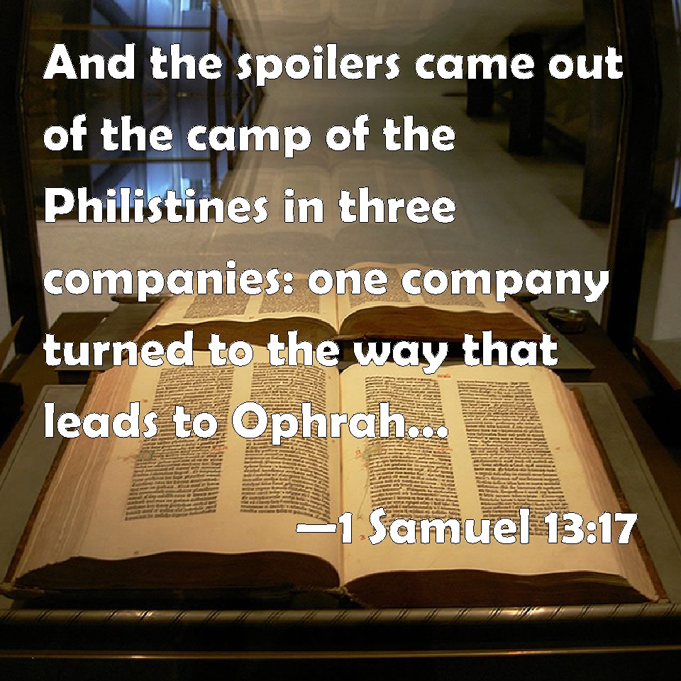 1 Samuel 13:17 And the spoilers came out of the camp of the Philistines in three companies: one company turned to the way that leads to Ophrah, to the land of Shual: