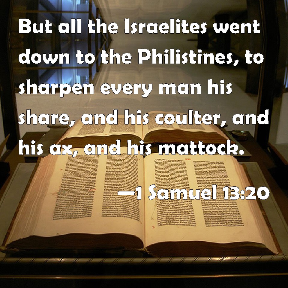 Choose a Background 1 Samuel 13:20 But all the Israelites went down to the Philistines, to sharpen every man his share, and his coulter, and his ax, and his mattock. KJV: But all the Israelites went down to the Philistines, to sharpen every man his share, and his coulter, and his axe, and his mattock. DRB: So all Israel went down to the Philistines, to sharpen every man his ploughshare, and his spade, and his axe, and his rake. DBT: And all Israel went down to the Philistines, every man to get his ploughshare, and his hoe, and his axe, and his sickle sharpened, ERV: but all the Israelites went down to the Philistines, to sharpen every man his share, and his coulter, and his axe, and his mattock; WBT: But all the Israelites went down to the Philistines, to sharpen every man his share, and his colter, and his ax, and his mattock. WEB: but all the Israelites went down to the Philistines, to sharpen every man his plowshare, mattock, axe, and sickle; YLT: and all Israel go down to the Philistines, to sharpen each his ploughshare, and his coulter, and his axe, and his mattock;Links 1 Samuel 13:20 NIV • 1 Samuel 13:20 NLT • 1 Samuel 13:20 ESV • 1 Samuel 13:20 NASB • 1 Samuel 13:20 KJV • 1 Samuel 13:20 Interlinear • 1 Samuel 13:20 Commentaries • 1 Samuel 13:20 Parallel Texts • 1 Samuel 13:20 Bible Apps • 1 Samuel 13:20 Parallel • Bible Hub |