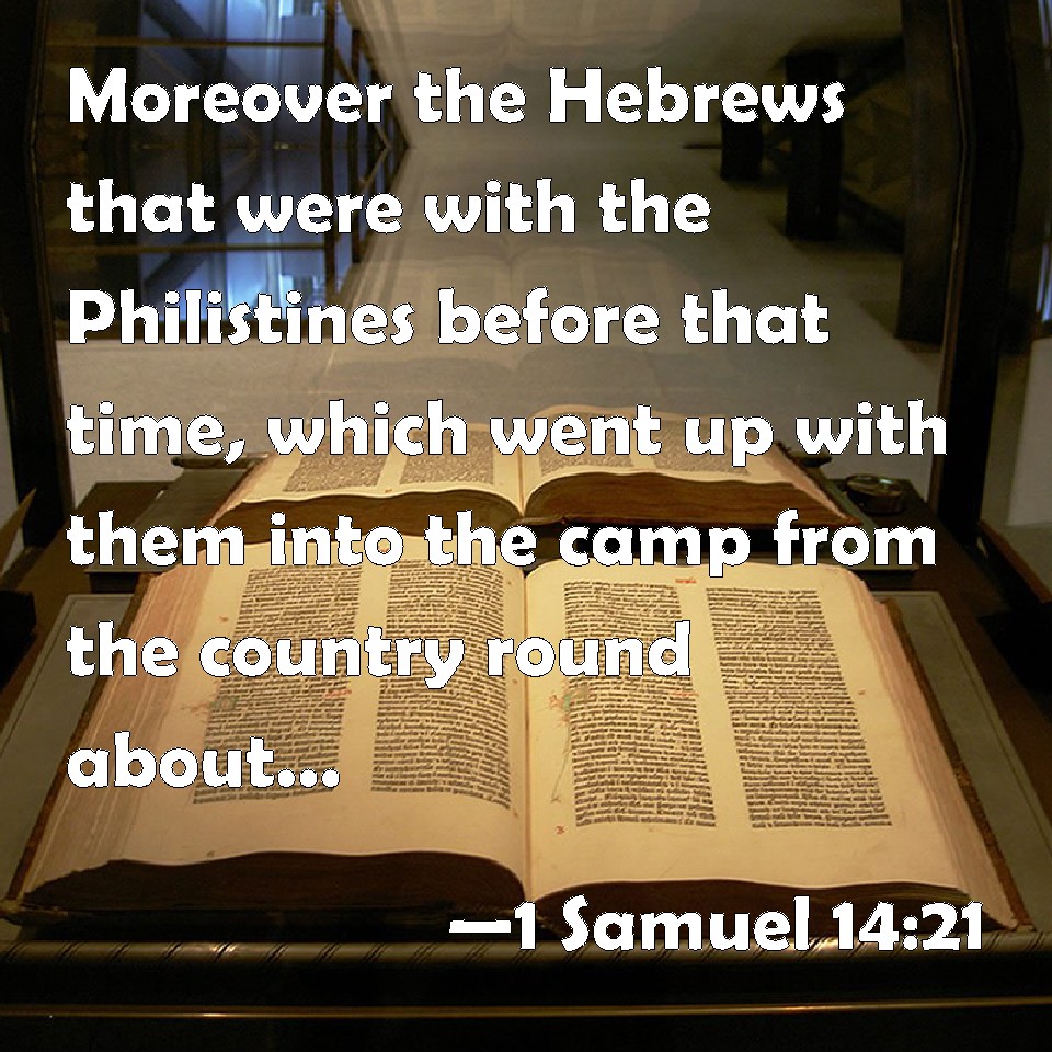 Choose a Background 1 Samuel 14:21 Moreover the Hebrews that were with the Philistines before that time, which went up with them into the camp from the country round about, even they also turned to be with the Israelites that were with Saul and Jonathan. KJV: Moreover the Hebrews that were with the Philistines before that time, which went up with them into the camp from the country round about, even they also turned to be with the Israelites that were with Saul and Jonathan. DRB: Moreover the Hebrews that had been with the Philistines yesterday and the day before, and went up with them into the camp, returned to be with the Israelites, who were with Saul and Jonathan. DBT: And there were Hebrews with the Philistines before that time, who had gone up with them into the camp round about; and they also turned to be with the Israelites who were with Saul and Jonathan. ERV: Now the Hebrews that were with the Philistines as beforetime, which went up with them into the camp from the country round about; even they also turned to be with the Israelites that were with Saul and Jonathan. WBT: Moreover the Hebrews that were with the Philistines before that time, who went up with them into the camp from the country around, even they also turned to be with the Israelites that were with Saul and Jonathan. WEB: Now the Hebrews who were with the Philistines as before, and who went up with them into the camp, [from the country] all around, even they also [turned] to be with the Israelites who were with Saul and Jonathan. YLT: And the Hebrews who have been for the Philistines as heretofore, who had gone up with them into the camp, have turned round, even they, to be with Israel who are with Saul and Jonathan,Links 1 Samuel 14:21 NIV • 1 Samuel 14:21 NLT • 1 Samuel 14:21 ESV • 1 Samuel 14:21 NASB • 1 Samuel 14:21 KJV • 1 Samuel 14:21 Interlinear • 1 Samuel 14:21 Commentaries • 1 Samuel 14:21 Parallel Texts • 1 Samuel 14:21 Bible Apps • 1 Samuel 14:21 Parallel • Bible Hub |