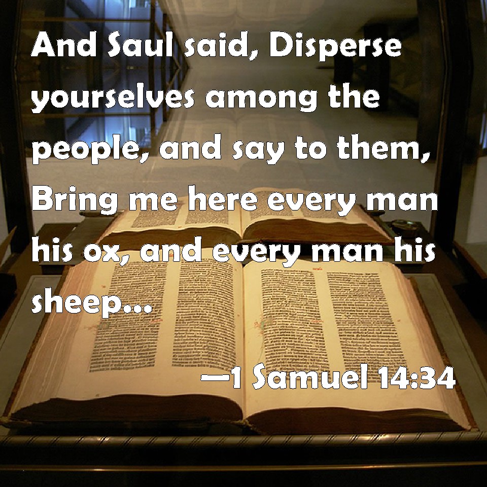 Choose a Background 1 Samuel 14:34 And Saul said, Disperse yourselves among the people, and say to them, Bring me here every man his ox, and every man his sheep, and slay them here, and eat; and sin not against the LORD in eating with the blood. And all the people brought every man his ox with him that night, and slew them there. KJV: And Saul said, Disperse yourselves among the people, and say unto them, Bring me hither every man his ox, and every man his sheep, and slay them here, and eat; and sin not against the LORD in eating with the blood. And all the people brought every man his ox with him that night, and slew them there. DRB: And Saul said: Disperse yourselves among the people, and tell them to bring me every man his ox and his ram, and slay them upon this stone, and eat, and you shall not sin against the Lord in eating with the blood. So all the people brought every man his ox with him till the night: and slew them there. DBT: And Saul said, Disperse yourselves among the people, and say to them, Bring near to me every man his ox, and every man his sheep, and slaughter them here, and eat; and sin not against Jehovah in eating with the blood. And all the people brought every man his ox with him that night, and slaughtered them there. ERV: And Saul said, Disperse yourselves among the people, and say unto them, Bring me hither every man his ox, and every man his sheep, and slay them here, and eat; and sin not against the LORD in eating with the blood. And all the people brought every man his ox with him that night, and slew them there. WBT: And Saul said, Disperse yourselves among the people, and say to them, Bring me hither every man his ox, and every man his sheep, and slay them here, and eat; and sin not against the LORD in eating with the blood. And all the people brought every man his ox with him that night, and slew them there. WEB: Saul said, "Disperse yourselves among the people, and tell them, 'Bring me here every man his ox, and every man his sheep, and kill them here, and eat; and don't sin against Yahweh in eating meat with the blood.'" All the people brought every man his ox with him that night, and killed them there. YLT: And Saul saith, 'Be ye scattered among the people, and ye have said to them, Bring ye nigh unto me each his ox, and each his sheep; and ye have slain them in this place, and eaten, and ye do not sin against Jehovah to eat with the blood.' And all the people bring nigh each his ox, in his hand, that night, and slaughter them there.Links 1 Samuel 14:34 NIV • 1 Samuel 14:34 NLT • 1 Samuel 14:34 ESV • 1 Samuel 14:34 NASB • 1 Samuel 14:34 KJV • 1 Samuel 14:34 Interlinear • 1 Samuel 14:34 Commentaries • 1 Samuel 14:34 Parallel Texts • 1 Samuel 14:34 Bible Apps • 1 Samuel 14:34 Parallel • Bible Hub |