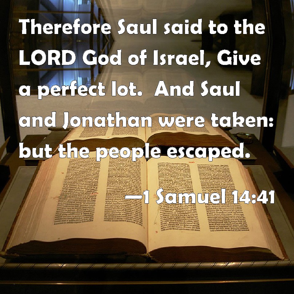 Choose a Background 1 Samuel 14:41 Therefore Saul said to the LORD God of Israel, Give a perfect lot. And Saul and Jonathan were taken: but the people escaped. KJV: Therefore Saul said unto the LORD God of Israel, Give a perfect lot. And Saul and Jonathan were taken: but the people escaped. DRB: And Saul said to the Lord: O Lord God of Israel, give a sign, by which we may know, what the meaning is, that thou answerest not thy servant to day. If this iniquity be in me, or in my son Jonathan, give a proof: or if this iniquity be in thy people, give holiness. And Jonathan and Saul were taken, and the people escaped. DBT: And Saul said to Jehovah the God of Israel, Give a perfect testimony! And Jonathan and Saul were taken, and the people escaped. ERV: Therefore Saul said unto the LORD, the God of Israel, Shew the right. And Jonathan and Saul were taken by lot: but the people escaped. WBT: Therefore Saul said to the LORD God of Israel, Give a perfect lot. And Saul and Jonathan were taken: but the people escaped. WEB: Therefore Saul said to Yahweh, the God of Israel, "Show the right." Jonathan and Saul were chosen; but the people escaped. YLT: And Saul saith unto Jehovah, God of Israel, 'Give perfection;' and Jonathan and Saul are captured, and the people went out.Links 1 Samuel 14:41 NIV • 1 Samuel 14:41 NLT • 1 Samuel 14:41 ESV • 1 Samuel 14:41 NASB • 1 Samuel 14:41 KJV • 1 Samuel 14:41 Interlinear • 1 Samuel 14:41 Commentaries • 1 Samuel 14:41 Parallel Texts • 1 Samuel 14:41 Bible Apps • 1 Samuel 14:41 Parallel • Bible Hub |