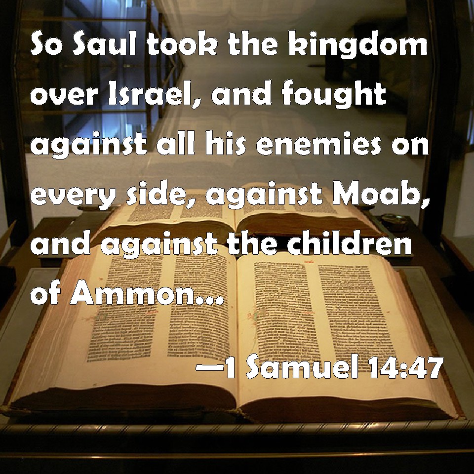 Choose a Background 1 Samuel 14:47 So Saul took the kingdom over Israel, and fought against all his enemies on every side, against Moab, and against the children of Ammon, and against Edom, and against the kings of Zobah, and against the Philistines: and wherever he turned himself, he vexed them. KJV: So Saul took the kingdom over Israel, and fought against all his enemies on every side, against Moab, and against the children of Ammon, and against Edom, and against the kings of Zobah, and against the Philistines: and whithersoever he turned himself, he vexed them. DRB: And Saul having his kingdom established over Israel, fought against all his enemies round about, against Moab, and against the children of Ammon, and Edom, and the kings of Soba, and the Philistines; and whithersoever he turned himself, he overcame. DBT: And Saul took the kingdom over Israel, and fought against all his enemies round about, against Moab, and against the children of Ammon, and against Edom, and against the kings of Zobah, and against the Philistines; and whithersoever he turned himself, he discomfited them. ERV: Now when Saul had taken the kingdom over Israel, he fought against all his enemies on every side, against Moab, and against the children of Ammon, and against Edom, and against the kings of Zobah, and against the Philistines: and whithersoever he turned himself, he vexed them. WBT: So Saul took the kingdom over Israel, and fought against all his enemies on every side, against Moab, and against the children of Ammon, and against Edom, and against the kings of Zobah, and against the Philistines: and whithersoever he turned himself, he harassed them. WEB: Now when Saul had taken the kingdom over Israel, he fought against all his enemies on every side, against Moab, and against the children of Ammon, and against Edom, and against the kings of Zobah, and against the Philistines: and wherever he turned himself, he put [them] to the worse. YLT: and Saul captured the kingdom over Israel, and he fighteth round about against all his enemies, against Moab, and against the Bene-Ammon, and against Edom, and against the kings of Zobah, and against the Philistines, and whithersoever he turneth he doth vex them.Links 1 Samuel 14:47 NIV • 1 Samuel 14:47 NLT • 1 Samuel 14:47 ESV • 1 Samuel 14:47 NASB • 1 Samuel 14:47 KJV • 1 Samuel 14:47 Interlinear • 1 Samuel 14:47 Commentaries • 1 Samuel 14:47 Parallel Texts • 1 Samuel 14:47 Bible Apps • 1 Samuel 14:47 Parallel • Bible Hub |