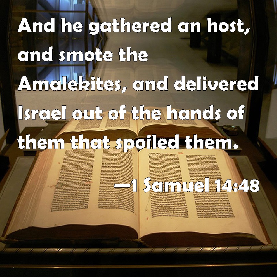 Choose a Background 1 Samuel 14:48 And he gathered an host, and smote the Amalekites, and delivered Israel out of the hands of them that spoiled them. KJV: And he gathered an host, and smote the Amalekites, and delivered Israel out of the hands of them that spoiled them. DRB: And gathering together an army, he defeated Amalec, and delivered Israel from the hand of them that spoiled them. DBT: And he did valiantly, and smote the Amalekites, and delivered Israel out of the hands of their spoilers. ERV: And he did valiantly, and smote the Amalekites, and delivered Israel out of the hands of them that spoiled them. WBT: And he gathered a host, and smote the Amalekites, and delivered Israel from the hands of them that spoiled them. WEB: He did valiantly, and struck the Amalekites, and delivered Israel out of the hands of those who despoiled them. YLT: And he maketh a force, and smiteth Amalek, and delivereth Israel out of the hand of its spoiler.Links 1 Samuel 14:48 NIV • 1 Samuel 14:48 NLT • 1 Samuel 14:48 ESV • 1 Samuel 14:48 NASB • 1 Samuel 14:48 KJV • 1 Samuel 14:48 Interlinear • 1 Samuel 14:48 Commentaries • 1 Samuel 14:48 Parallel Texts • 1 Samuel 14:48 Bible Apps • 1 Samuel 14:48 Parallel • Bible Hub |