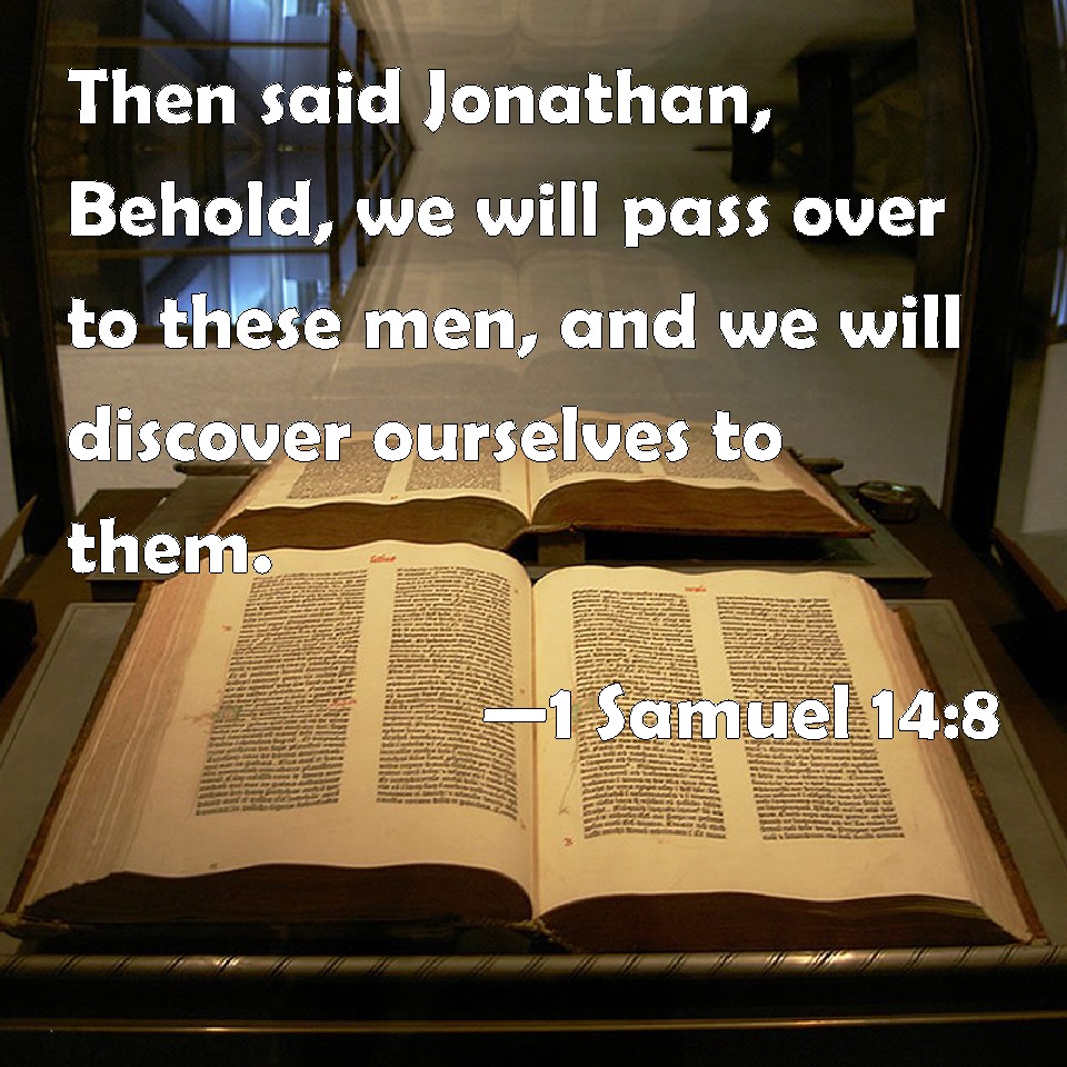 Choose a Background 1 Samuel 14:8 Then said Jonathan, Behold, we will pass over to these men, and we will discover ourselves to them. KJV: Then said Jonathan, Behold, we will pass over unto these men, and we will discover ourselves unto them. DRB: And Jonathan said: Behold we will go over to these men. And when we shall be seen by them, DBT: Then said Jonathan, Behold, we will pass over to the men, and we will shew ourselves to them. ERV: Then said Jonathan, Behold, we will pass over unto the men, and we will discover ourselves unto them. WBT: Then said Jonathan, Behold, we will pass over to these men, and we will discover ourselves to them. WEB: Then Jonathan said, "Behold, we will pass over to the men, and we will reveal ourselves to them. YLT: And Jonathan saith, 'Lo, we are passing over unto the men, and are revealed unto them;Links 1 Samuel 14:8 NIV • 1 Samuel 14:8 NLT • 1 Samuel 14:8 ESV • 1 Samuel 14:8 NASB • 1 Samuel 14:8 KJV • 1 Samuel 14:8 Interlinear • 1 Samuel 14:8 Commentaries • 1 Samuel 14:8 Parallel Texts • 1 Samuel 14:8 Bible Apps • 1 Samuel 14:8 Parallel • Bible Hub |