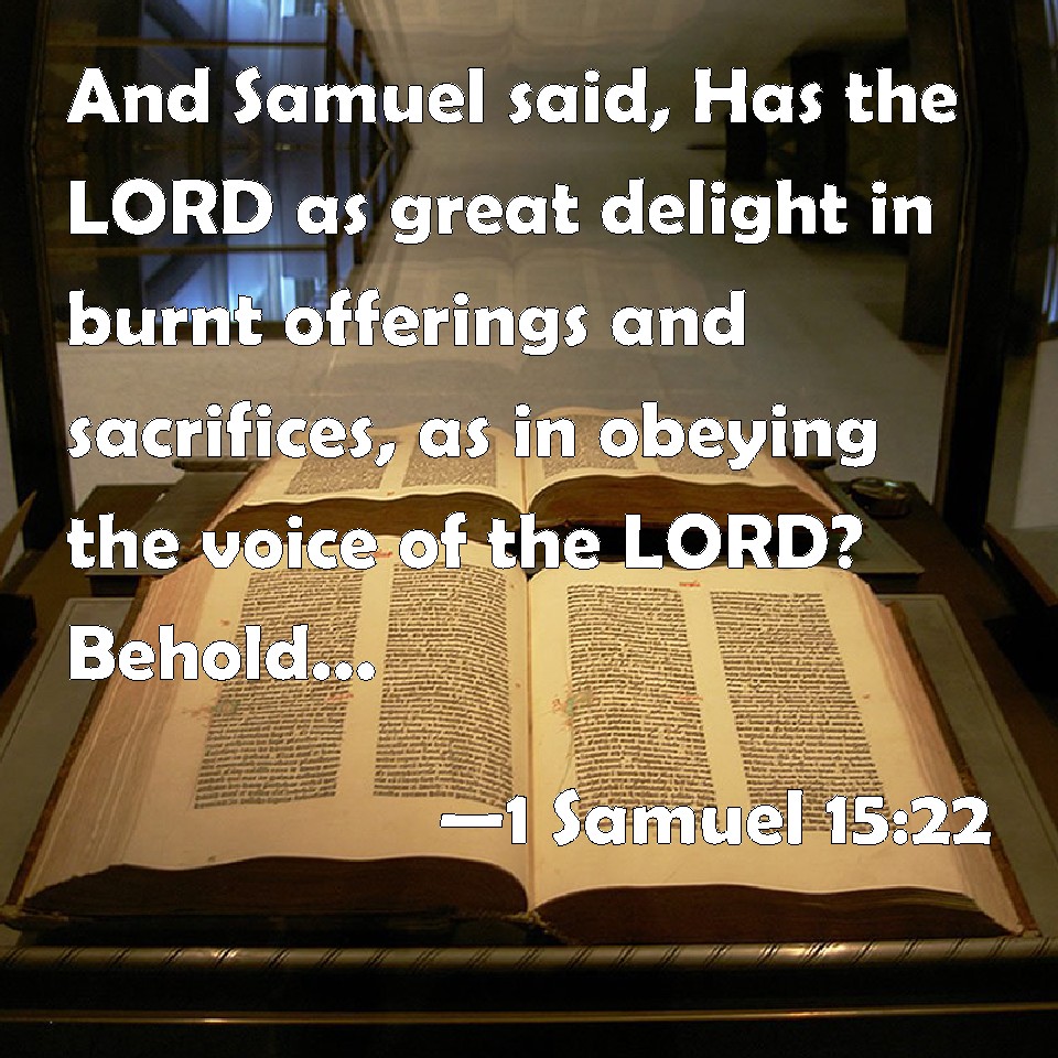 Choose a Background 1 Samuel 15:22 And Samuel said, Has the LORD as great delight in burnt offerings and sacrifices, as in obeying the voice of the LORD? Behold, to obey is better than sacrifice, and to listen than the fat of rams. KJV: And Samuel said, Hath the LORD as great delight in burnt offerings and sacrifices, as in obeying the voice of the LORD? Behold, to obey is better than sacrifice, and to hearken than the fat of rams. DRB: And Samuel said: Doth the Lord desire holocausts and victims, and not rather that the voice of the Lord should be obeyed? For obedience is better than sacrifices: and to hearken rather than to offer the fat of rams. DBT: And Samuel said, Has Jehovah delight in burnt-offerings and sacrifices, As in hearkening to the voice of Jehovah? Behold, obedience is better than sacrifice, Attention than the fat of rams. ERV: And Samuel said, Hath the LORD as great delight in burnt offerings and sacrifices, as in obeying the voice of the LORD? Behold, to obey is better than sacrifice, and to hearken than the fat of rams. WBT: And Samuel said, Hath the LORD as great delight in burnt-offerings and sacrifices, as in obeying the voice of the LORD? Behold, to obey is better than sacrifice, and to hearken than the fat of rams. WEB: Samuel said, "Has Yahweh as great delight in burnt offerings and sacrifices, as in obeying the voice of Yahweh? Behold, to obey is better than sacrifice, and to listen than the fat of rams. YLT: And Samuel saith, 'Hath Jehovah had delight in burnt-offerings and sacrifices as in hearkening to the voice of Jehovah? lo, hearkening than sacrifice is better; to give attention than fat of rams;Links 1 Samuel 15:22 NIV • 1 Samuel 15:22 NLT • 1 Samuel 15:22 ESV • 1 Samuel 15:22 NASB • 1 Samuel 15:22 KJV • 1 Samuel 15:22 Interlinear • 1 Samuel 15:22 Commentaries • 1 Samuel 15:22 Parallel Texts • 1 Samuel 15:22 Bible Apps • 1 Samuel 15:22 Parallel • Bible Hub |