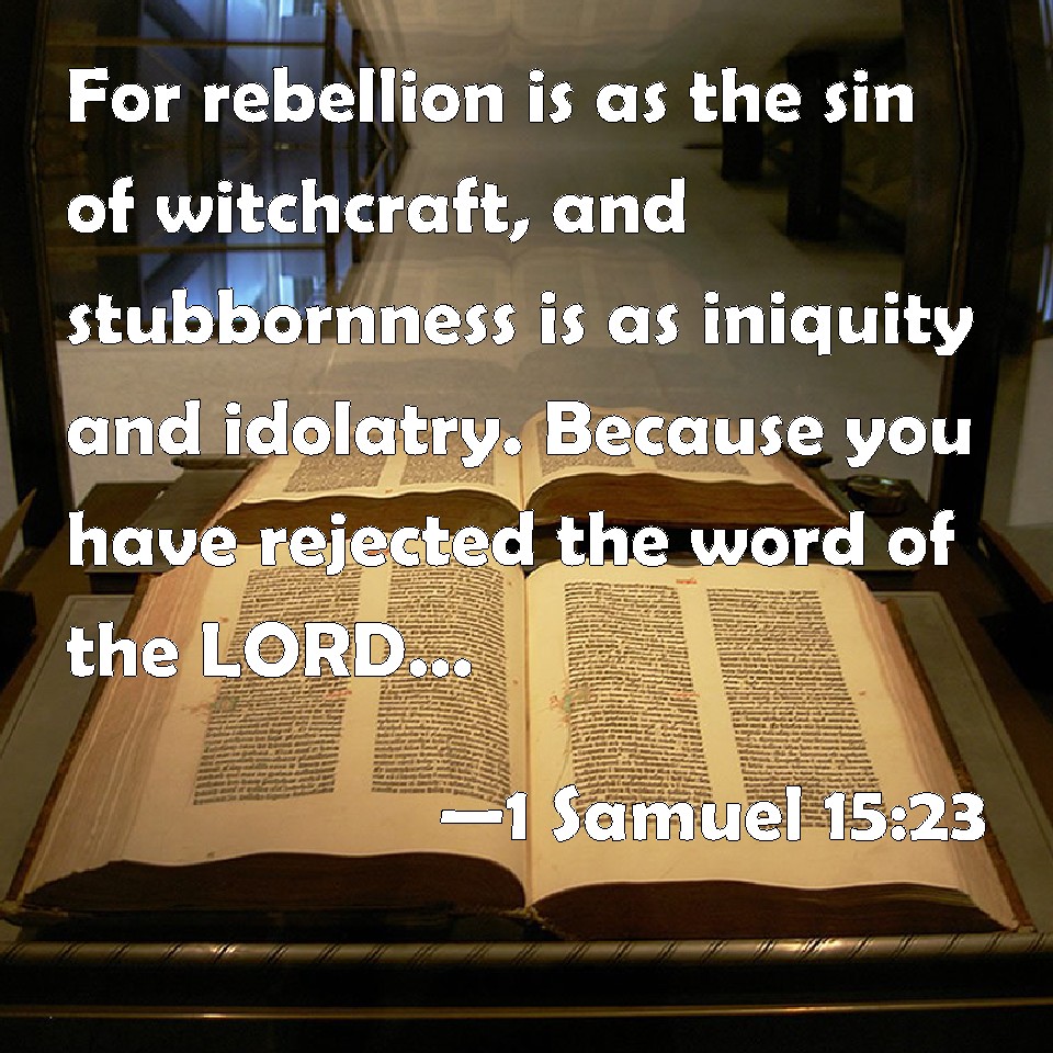 Choose a Background 1 Samuel 15:23 For rebellion is as the sin of witchcraft, and stubbornness is as iniquity and idolatry. Because you have rejected the word of the LORD, he has also rejected you from being king. KJV: For rebellion is as the sin of witchcraft, and stubbornness is as iniquity and idolatry. Because thou hast rejected the word of the LORD, he hath also rejected thee from being king. DRB: Because it is like the sin of witchcraft, to rebel: and like the crime of idolatry, to refuse to obey. Forasmuch therefore as thou hast rejected the word of the Lord, the Lord hath also rejected thee from being king. DBT: For rebellion is as the sin of divination, And selfwill is as iniquity and idolatry. Because thou hast rejected the word of Jehovah, He hath also rejected thee from being king. ERV: For rebellion is as the sin of witchcraft, and stubbornness is as idolatry and teraphim. Because thou hast rejected the word of the LORD, he hath also rejected thee from being king. WBT: For rebellion is as the sin of witchcraft, and stubbornness is as iniquity and idolatry. Because thou hast rejected the word of the LORD, he hath also rejected thee from being king. WEB: For rebellion is as the sin of witchcraft, and stubbornness is as idolatry and teraphim. Because you have rejected the word of Yahweh, he has also rejected you from being king." YLT: for a sin of divination is rebellion, and iniquity and teraphim is stubbornness; because thou hast rejected the word of Jehovah, He also doth reject thee from being king.'Links 1 Samuel 15:23 NIV • 1 Samuel 15:23 NLT • 1 Samuel 15:23 ESV • 1 Samuel 15:23 NASB • 1 Samuel 15:23 KJV • 1 Samuel 15:23 Interlinear • 1 Samuel 15:23 Commentaries • 1 Samuel 15:23 Parallel Texts • 1 Samuel 15:23 Bible Apps • 1 Samuel 15:23 Parallel • Bible Hub |