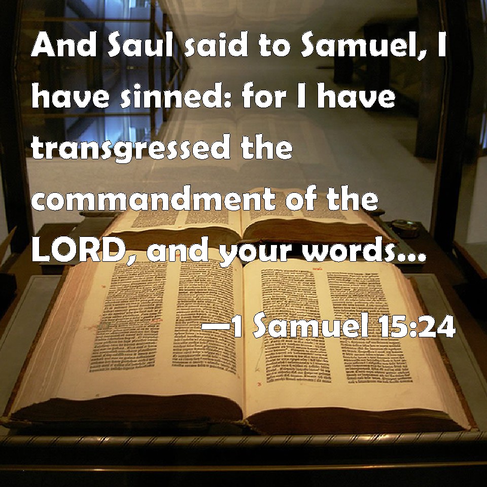 Choose a Background 1 Samuel 15:24 And Saul said to Samuel, I have sinned: for I have transgressed the commandment of the LORD, and your words: because I feared the people, and obeyed their voice. KJV: And Saul said unto Samuel, I have sinned: for I have transgressed the commandment of the LORD, and thy words: because I feared the people, and obeyed their voice. DRB: And Saul said to Samuel: I have sinned because I have transgressed the commandment of the Lord, and thy words, fearing the people, and obeying their voice. DBT: And Saul said to Samuel, I have sinned, for I have transgressed the commandment of Jehovah, and thy words; for I feared the people, and hearkened to their voice. ERV: And Saul said unto Samuel, I have sinned: for I have transgressed the commandment of the LORD, and thy words: because I feared the people, and obeyed their voice. WBT: And Saul said to Samuel, I have sinned: for I have transgressed the commandment of the LORD, and thy words; because I feared the people, and obeyed their voice. WEB: Saul said to Samuel, "I have sinned; for I have transgressed the commandment of Yahweh, and your words, because I feared the people, and obeyed their voice. YLT: And Saul saith unto Samuel, 'I have sinned, for I passed over the command of Jehovah, and thy words; because I have feared the people, I also hearken to their voice;Links 1 Samuel 15:24 NIV • 1 Samuel 15:24 NLT • 1 Samuel 15:24 ESV • 1 Samuel 15:24 NASB • 1 Samuel 15:24 KJV • 1 Samuel 15:24 Interlinear • 1 Samuel 15:24 Commentaries • 1 Samuel 15:24 Parallel Texts • 1 Samuel 15:24 Bible Apps • 1 Samuel 15:24 Parallel • Bible Hub |