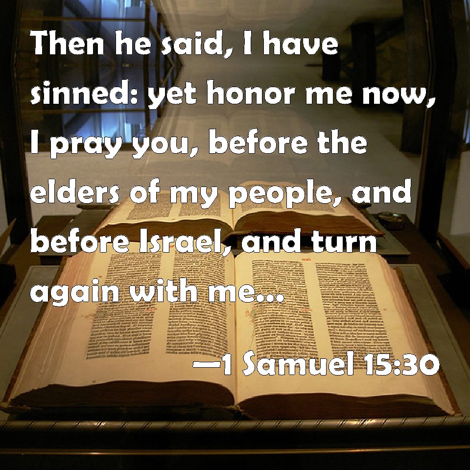 Choose a Background 1 Samuel 15:30 Then he said, I have sinned: yet honor me now, I pray you, before the elders of my people, and before Israel, and turn again with me, that I may worship the LORD your God. KJV: Then he said, I have sinned: yet honour me now, I pray thee, before the elders of my people, and before Israel, and turn again with me, that I may worship the LORD thy God. DRB: Then he said: I have sinned: yet honour me now before the ancients of my people, and before Israel, and return with me, that I may adore the Lord thy God. DBT: And he said, I have sinned; honour me now, I pray thee, before the elders of my people, and before Israel, and turn again with me, that I may worship Jehovah thy God. ERV: Then he said, I have sinned: yet honour me now, I pray thee, before the elders of my people, and before Israel, and turn again with me, that I may worship the LORD thy God. WBT: Then he said, I have sinned: yet honor me now, I pray thee, before the elders of my people, and before Israel, and turn again with me, that I may worship the LORD thy God. WEB: Then he said, "I have sinned: yet please honor me now before the elders of my people, and before Israel, and come back with me, that I may worship Yahweh your God." YLT: And he saith, 'I have sinned; now, honour me, I pray thee, before the elders of my people, and before Israel, and turn back with me; and I have bowed myself to Jehovah thy God.'Links 1 Samuel 15:30 NIV • 1 Samuel 15:30 NLT • 1 Samuel 15:30 ESV • 1 Samuel 15:30 NASB • 1 Samuel 15:30 KJV • 1 Samuel 15:30 Interlinear • 1 Samuel 15:30 Commentaries • 1 Samuel 15:30 Parallel Texts • 1 Samuel 15:30 Bible Apps • 1 Samuel 15:30 Parallel • Bible Hub |