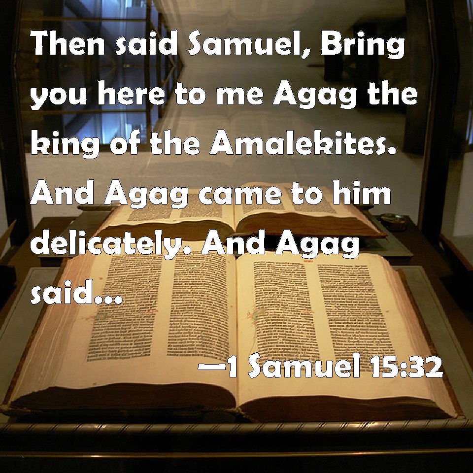Choose a Background 1 Samuel 15:32 Then said Samuel, Bring you here to me Agag the king of the Amalekites. And Agag came to him delicately. And Agag said, Surely the bitterness of death is past. KJV: Then said Samuel, Bring ye hither to me Agag the king of the Amalekites. And Agag came unto him delicately. And Agag said, Surely the bitterness of death is past. DRB: And Samuel said: Bring hitherto me Agag the king of Amalec. And Agag was presented to him very fat, and trembling. And Agag said: Doth bitter death separate in this manner? DBT: And Samuel said, Bring ye near to me Agag the king of Amalek. And Agag came to him gaily. And Agag said, Surely the bitterness of death is past. ERV: Then said Samuel, Bring ye hither to me Agag the king of the Amalekites. And Agag came unto him delicately. And Agag said, Surely the bitterness of death is past. WBT: Then said Samuel, Bring ye hither to me Agag the king of the Amalekites. And Agag came to him delicately. And Agag said, Surely the bitterness of death is past. WEB: Then Samuel said, "Bring here to me Agag the king of the Amalekites!" Agag came to him cheerfully. Agag said, "Surely the bitterness of death is past." YLT: and Samuel saith, 'Bring ye nigh unto me Agag king of Amalek,' and Agag cometh unto him daintily, and Agag saith, 'Surely the bitterness of death hath turned aside.'Links 1 Samuel 15:32 NIV • 1 Samuel 15:32 NLT • 1 Samuel 15:32 ESV • 1 Samuel 15:32 NASB • 1 Samuel 15:32 KJV • 1 Samuel 15:32 Interlinear • 1 Samuel 15:32 Commentaries • 1 Samuel 15:32 Parallel Texts • 1 Samuel 15:32 Bible Apps • 1 Samuel 15:32 Parallel • Bible Hub |