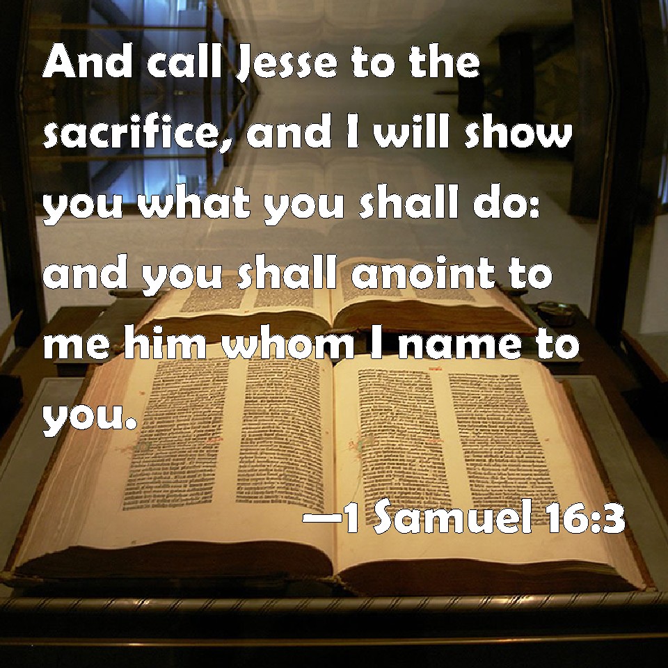 Choose a Background 1 Samuel 16:3 And call Jesse to the sacrifice, and I will show you what you shall do: and you shall anoint to me him whom I name to you. KJV: And call Jesse to the sacrifice, and I will shew thee what thou shalt do: and thou shalt anoint unto me him whom I name unto thee. DRB: And thou shalt call Isai to the sacrifice, and I will shew thee what thou art to do, and thou shalt anoint him whom I shall shew to thee. DBT: And call Jesse to the sacrifice, and I will tell thee what thou shalt do; and thou shalt anoint unto me him whom I name unto thee. ERV: And call Jesse to the sacrifice, and I will shew thee what thou shalt do: and thou shalt anoint unto me him whom I name unto thee. WBT: And call Jesse to the sacrifice, and I will show thee what thou shalt do: and thou shalt anoint to me him whom I name to thee. WEB: Call Jesse to the sacrifice, and I will show you what you shall do. You shall anoint to me him whom I name to you." YLT: and thou hast called for Jesse in the sacrifice, and I cause thee to know that which thou dost do, and thou hast anointed to Me him of whom I speak unto thee.'Links 1 Samuel 16:3 NIV • 1 Samuel 16:3 NLT • 1 Samuel 16:3 ESV • 1 Samuel 16:3 NASB • 1 Samuel 16:3 KJV • 1 Samuel 16:3 Interlinear • 1 Samuel 16:3 Commentaries • 1 Samuel 16:3 Parallel Texts • 1 Samuel 16:3 Bible Apps • 1 Samuel 16:3 Parallel • Bible Hub |