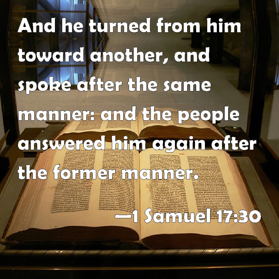 1 Samuel 17:30 And he turned from him toward another, and spoke after the same manner: and the people answered him again after the former manner.