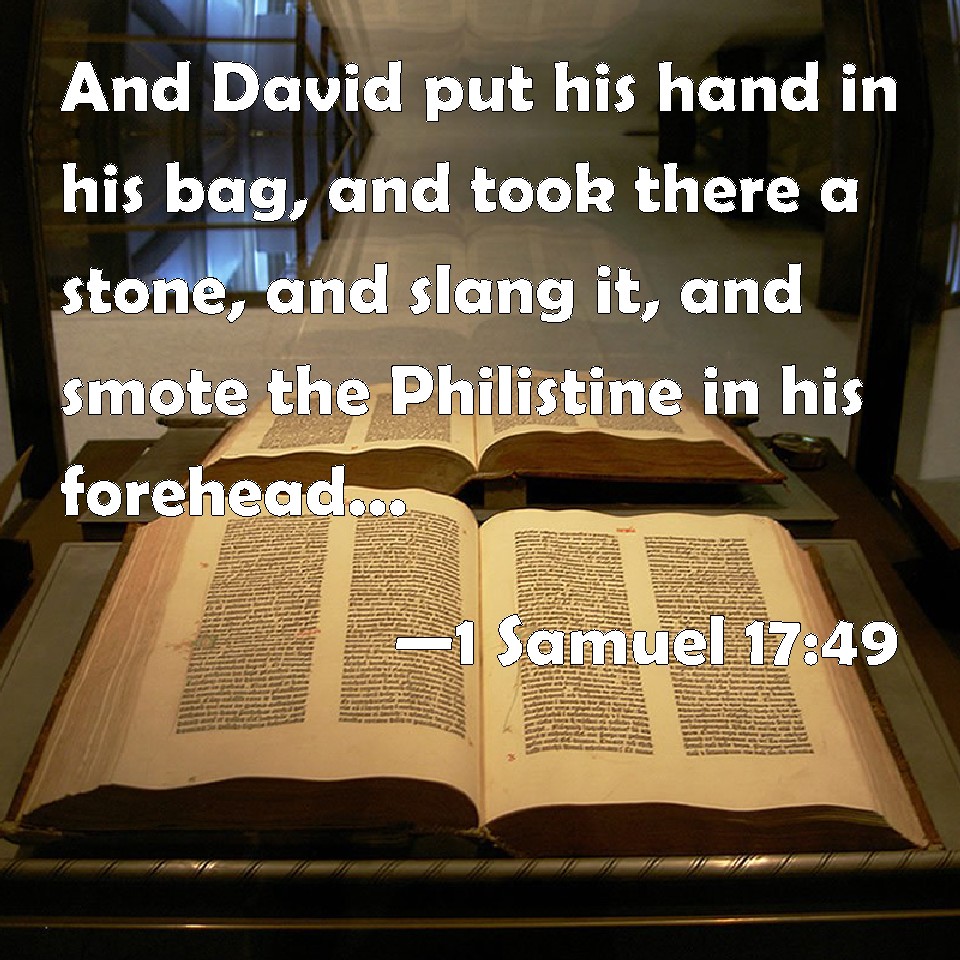 Choose a Background 1 Samuel 17:49 And David put his hand in his bag, and took there a stone, and slang it, and smote the Philistine in his forehead, that the stone sunk into his forehead; and he fell on his face to the earth. KJV: And David put his hand in his bag, and took thence a stone, and slang it, and smote the Philistine in his forehead, that the stone sunk into his forehead; and he fell upon his face to the earth. DRB: And he put his hand into his scrip, and took a stone, and cast it with the sling, and fetching it about struck the Philistine in the forehead: and the stone was fixed in his forehead, and he fell on his face upon the earth. DBT: And David put his hand into the bag, and took thence a stone, and slang it, and smote the Philistine in his forehead, and the stone sank into his forehead; and he fell on his face to the earth. ERV: And David put his hand in his bag, and took thence a stone, and slang it, and smote the Philistine in his forehead; and the stone sank into his forehead, and he fell upon his face to the earth. WBT: And David put his hand in his bag, and took thence a stone, and hurled it with his sling, and smote the Philistine in his forehead, that the stone sunk into his forehead; and he fell upon his face to the earth. WEB: David put his hand in his bag, took a stone, and slung it, and struck the Philistine in his forehead; and the stone sank into his forehead, and he fell on his face to the earth. YLT: and David putteth forth his hand unto the vessel, and taketh thence a stone, and slingeth, and smiteth the Philistine on his forehead, and the stone sinketh into his forehead, and he falleth on his face to the earth.Links 1 Samuel 17:49 NIV • 1 Samuel 17:49 NLT • 1 Samuel 17:49 ESV • 1 Samuel 17:49 NASB • 1 Samuel 17:49 KJV • 1 Samuel 17:49 Interlinear • 1 Samuel 17:49 Commentaries • 1 Samuel 17:49 Parallel Texts • 1 Samuel 17:49 Bible Apps • 1 Samuel 17:49 Parallel • Bible Hub |