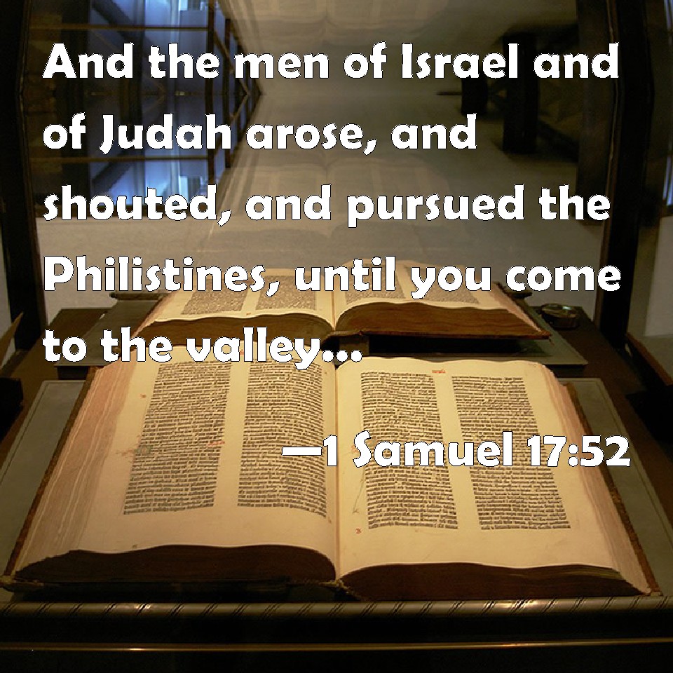 Choose a Background 1 Samuel 17:52 And the men of Israel and of Judah arose, and shouted, and pursued the Philistines, until you come to the valley, and to the gates of Ekron. And the wounded of the Philistines fell down by the way to Shaaraim, even to Gath, and to Ekron. KJV: And the men of Israel and of Judah arose, and shouted, and pursued the Philistines, until thou come to the valley, and to the gates of Ekron. And the wounded of the Philistines fell down by the way to Shaaraim, even unto Gath, and unto Ekron. DRB: And the men of Israel and Juda rising up shouted, and pursued after the Philistines till they came to the valley and to the gates of Accaron, and there fell many wounded of the Philistines in the way of Saraim, and as far as Geth, and as far as Accaron. DBT: And the men of Israel and of Judah arose, and shouted, and pursued the Philistines, until thou comest to the ravine and to the gates of Ekron. And the wounded of the Philistines fell down on the way to Shaaraim, even to Gath, and to Ekron. ERV: And the men of Israel and of Judah arose, and shouted, and pursued the Philistines, until thou comest to Gai, and to the gates of Ekron. And the wounded of the Philistines fell down by the way to Shaaraim, even unto Gath, and unto Ekron. WBT: And the men of Israel and of Judah arose, and shouted, and pursued the Philistines to the entrance of the valley, and to the gates of Ekron. And the wounded of the Philistines fell down by the way to Shaaraim, even to Gath, and to Ekron. WEB: The men of Israel and of Judah arose, and shouted, and pursued the Philistines, until you come to Gai, and to the gates of Ekron. The wounded of the Philistines fell down by the way to Shaaraim, even to Gath, and to Ekron. YLT: And the men of Israel rise — also Judah — and shout, and pursue the Philistines till thou enter the valley, and unto the gates of Ekron, and the wounded of the Philistines fall in the way of Shaaraim, even unto Gath, and unto Ekron,Links 1 Samuel 17:52 NIV • 1 Samuel 17:52 NLT • 1 Samuel 17:52 ESV • 1 Samuel 17:52 NASB • 1 Samuel 17:52 KJV • 1 Samuel 17:52 Interlinear • 1 Samuel 17:52 Commentaries • 1 Samuel 17:52 Parallel Texts • 1 Samuel 17:52 Bible Apps • 1 Samuel 17:52 Parallel • Bible Hub |