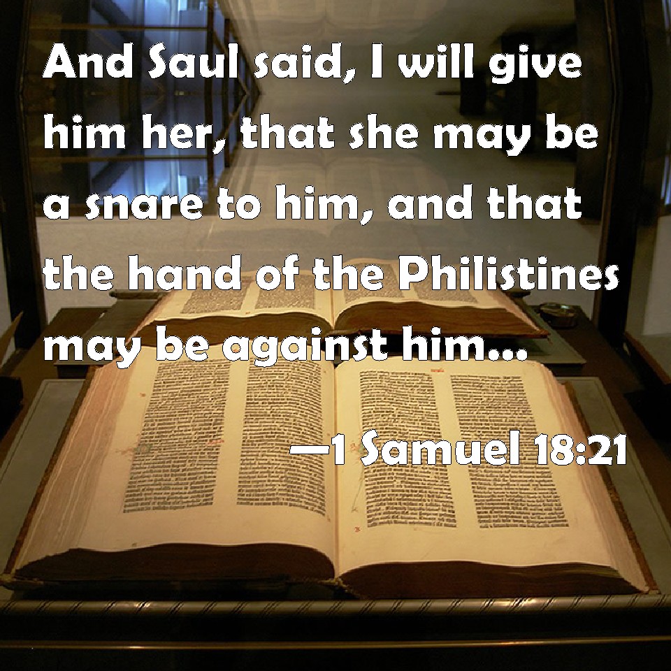 Choose a Background 1 Samuel 18:21 And Saul said, I will give him her, that she may be a snare to him, and that the hand of the Philistines may be against him. Why Saul said to David, You shall this day be my son in law in the one of the two. KJV: And Saul said, I will give him her, that she may be a snare to him, and that the hand of the Philistines may be against him. Wherefore Saul said to David, Thou shalt this day be my son in law in the one of the twain. DRB: And Saul said: I will give her to him, that she may be a stumblingblock to him, and that the band of the Philistines may be upon him. And Saul said to David: In two things thou shalt be my son in law this day. DBT: And Saul said, I will give him her, that she may be a snare to him, and that the hand of the Philistines may be upon him. And Saul said to David, Thou shalt this day be my son-in-law a second time. ERV: And Saul said, I will give him her, that she may be a snare to him, and that the hand of the Philistines may be against him. Wherefore Saul said to David, Thou shalt this day be my son in law a second time. WBT: And Saul said, I will give her to him, that she may be a snare to him, and that the hand of the Philistines may be against him. Wherefore Saul said to David, Thou shalt this day be my son-in-law, in the one of the two. WEB: Saul said, I will give her to him, that she may be a snare to him, and that the hand of the Philistines may be against him. Therefore Saul said to David, "You shall this day be my son-in-law a second time." YLT: and Saul saith, 'I give her to him, and she is to him for a snare, and the hand of the Philistines is on him;' and Saul saith unto David, 'By the second — thou dost become my son-in-law to-day.'Links 1 Samuel 18:21 NIV • 1 Samuel 18:21 NLT • 1 Samuel 18:21 ESV • 1 Samuel 18:21 NASB • 1 Samuel 18:21 KJV • 1 Samuel 18:21 Interlinear • 1 Samuel 18:21 Commentaries • 1 Samuel 18:21 Parallel Texts • 1 Samuel 18:21 Bible Apps • 1 Samuel 18:21 Parallel • Bible Hub |