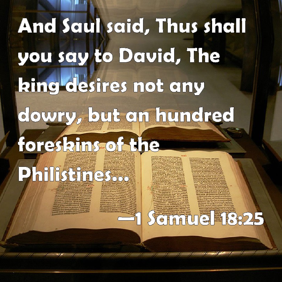 Choose a Background 1 Samuel 18:25 And Saul said, Thus shall you say to David, The king desires not any dowry, but an hundred foreskins of the Philistines, to be avenged of the king's enemies. But Saul thought to make David fall by the hand of the Philistines. KJV: And Saul said, Thus shall ye say to David, The king desireth not any dowry, but an hundred foreskins of the Philistines, to be avenged of the king's enemies. But Saul thought to make David fall by the hand of the Philistines. DRB: And Saul said: Speak thus to David: The king desireth not any dowry, but only a hundred foreskins of the Philistines, to be avenged of the king's enemies. Now Saul thought to deliver David into the hands of the Philistines. DBT: And Saul said, Thus shall ye say to David: The king does not desire any dowry, but a hundred foreskins of the Philistines, to be avenged of the king's enemies. But Saul thought to make David fall by the hand of the Philistines. ERV: And Saul said, Thus shall ye say to David, The king desireth not any dowry, but an hundred foreskins of the Philistines, to be avenged of the king's enemies. Now Saul thought to make David fall by the hand of the Philistines. WBT: And Saul said, Thus shall ye say to David, The king desireth not any dower, but a hundred foreskins of the Philistines, to be avenged of the king's enemies. But Saul thought to make David fall by the hand of the Philistines. WEB: Saul said, "You shall tell David, 'The king desires no dowry except one hundred foreskins of the Philistines, to be avenged of the king's enemies.'" Now Saul thought to make David fall by the hand of the Philistines. YLT: And Saul saith, 'Thus do ye say to David, There is no delight to the king in dowry, but in a hundred foreskins of the Philistines — to be avenged on the enemies of the king;' and Saul thought to cause David to fall by the hand of the Philistines.Links 1 Samuel 18:25 NIV • 1 Samuel 18:25 NLT • 1 Samuel 18:25 ESV • 1 Samuel 18:25 NASB • 1 Samuel 18:25 KJV • 1 Samuel 18:25 Interlinear • 1 Samuel 18:25 Commentaries • 1 Samuel 18:25 Parallel Texts • 1 Samuel 18:25 Bible Apps • 1 Samuel 18:25 Parallel • Bible Hub |