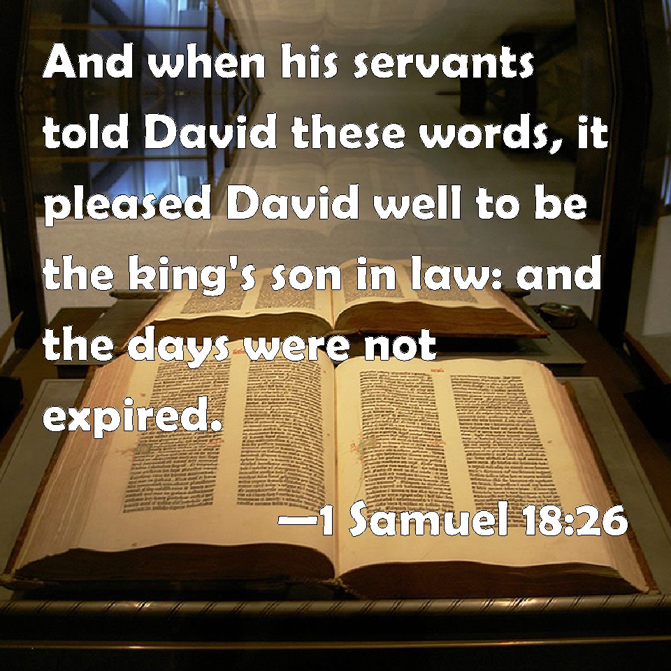Choose a Background 1 Samuel 18:26 And when his servants told David these words, it pleased David well to be the king's son in law: and the days were not expired. KJV: And when his servants told David these words, it pleased David well to be the king's son in law: and the days were not expired. DRB: And when his servants had told David the words that Saul had said, the word was pleasing in the eyes of David to be the king's son in law. DBT: And his servants told David these words; and the thing was right in David's sight to be the king's son-in-law. And the days were not expired, ERV: And when his servants told David these words, it pleased David well to be the king's son in law. And the days were not expired; WBT: And when his servants told David these words, it pleased David well to be the king's son-in-law: and the days had not expired. WEB: When his servants told David these words, it pleased David well to be the king's son-in-law. The days were not expired; YLT: And his servants declare to David these words, and the thing is right in the eyes of David, to be son-in-law to the king; and the days have not been full,Links 1 Samuel 18:26 NIV • 1 Samuel 18:26 NLT • 1 Samuel 18:26 ESV • 1 Samuel 18:26 NASB • 1 Samuel 18:26 KJV • 1 Samuel 18:26 Interlinear • 1 Samuel 18:26 Commentaries • 1 Samuel 18:26 Parallel Texts • 1 Samuel 18:26 Bible Apps • 1 Samuel 18:26 Parallel • Bible Hub |