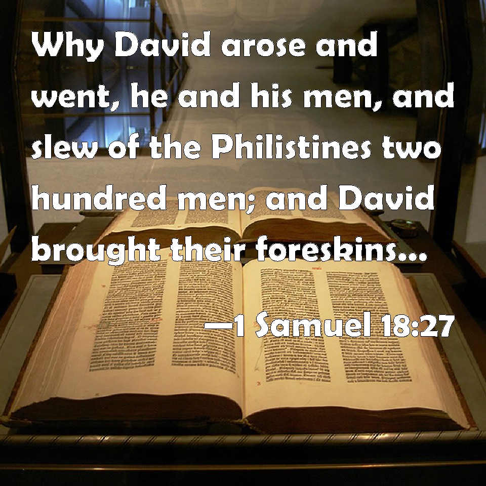 Choose a Background 1 Samuel 18:27 Why David arose and went, he and his men, and slew of the Philistines two hundred men; and David brought their foreskins, and they gave them in full tale to the king, that he might be the king's son in law. And Saul gave him Michal his daughter to wife. KJV: Wherefore David arose and went, he and his men, and slew of the Philistines two hundred men; and David brought their foreskins, and they gave them in full tale to the king, that he might be the king's son in law. And Saul gave him Michal his daughter to wife. DRB: And after a few days David rose up, and went with the men that were under him, and he slew of the Philistines two hundred men, and brought their foreskins and numbered them out to the king, that he might be his son in law. Saul therefore gave him Michol his daughter to wife. DBT: when David arose and went, he and his men, and smote of the Philistines two hundred men; and David brought their foreskins, and they delivered them in full to the king, that he might be the king's son-in-law. And Saul gave him Michal his daughter as wife. ERV: and David arose and went, he and his men, and slew of the Philistines two hundred men; and David brought their foreskins, and they gave them in full tale to the king, that he might be the king's son in law. And Saul gave him Michal his daughter to wife. WBT: Wherefore David arose and went, he and his men, and slew of the Philistines two hundred men; and David brought their foreskins, and they gave them in full number to the king, that he might be the king's son-in-law. And Saul gave him Michal his daughter for a wife. WEB: and David arose and went, he and his men, and killed of the Philistines two hundred men; and David brought their foreskins, and they gave them in full number to the king, that he might be the king's son-in-law. Saul gave him Michal his daughter as wife. YLT: and David riseth and goeth, he and his men, and smiteth among the Philistines two hundred men, and David bringeth in their foreskins, and they set them before the king, to be son-in-law to the king; and Saul giveth to him Michal his daughter for a wife.Links 1 Samuel 18:27 NIV • 1 Samuel 18:27 NLT • 1 Samuel 18:27 ESV • 1 Samuel 18:27 NASB • 1 Samuel 18:27 KJV • 1 Samuel 18:27 Interlinear • 1 Samuel 18:27 Commentaries • 1 Samuel 18:27 Parallel Texts • 1 Samuel 18:27 Bible Apps • 1 Samuel 18:27 Parallel • Bible Hub |