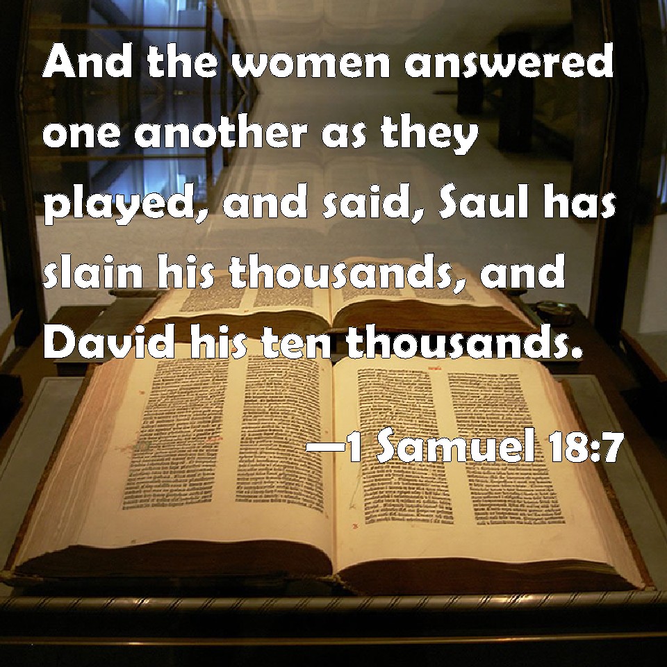 Choose a Background 1 Samuel 18:7 And the women answered one another as they played, and said, Saul has slain his thousands, and David his ten thousands. KJV: And the women answered one another as they played, and said, Saul hath slain his thousands, and David his ten thousands. DRB: And the women sung as they played, and they said: Saul slew his thousands, and David his ten thousands. DBT: And the women answered one another as they played, and said, Saul hath smitten his thousands, And David his ten thousands. ERV: And the women sang one to another in their play, and said, Saul hath slain his thousands, and David his ten thousands. WBT: And the women answered one another as they played, and said, Saul hath slain his thousands, and David his ten thousands. WEB: The women sang one to another as they played, and said, "Saul has slain his thousands, David his ten thousands." YLT: and the women answer — those playing, and say, 'Saul hath smitten among his thousands, And David among his myriads.'Links 1 Samuel 18:7 NIV • 1 Samuel 18:7 NLT • 1 Samuel 18:7 ESV • 1 Samuel 18:7 NASB • 1 Samuel 18:7 KJV • 1 Samuel 18:7 Interlinear • 1 Samuel 18:7 Commentaries • 1 Samuel 18:7 Parallel Texts • 1 Samuel 18:7 Bible Apps • 1 Samuel 18:7 Parallel • Bible Hub |