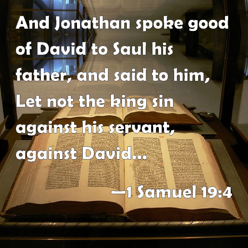 Choose a Background 1 Samuel 19:4 And Jonathan spoke good of David to Saul his father, and said to him, Let not the king sin against his servant, against David; because he has not sinned against you, and because his works have been to you-ward very good: KJV: And Jonathan spake good of David unto Saul his father, and said unto him, Let not the king sin against his servant, against David; because he hath not sinned against thee, and because his works have been to theeward very good: DRB: And Jonathan spoke good things of David to Saul his father: and said to him: Sin not, O king, against thy servant, David, because he hath not sinned against thee, and his works are very good towards thee. DBT: And Jonathan spoke good of David to Saul his father, and said to him, Let not the king sin against his servant, against David, because he has not sinned against thee; for also what he did was very advantageous to thee; ERV: And Jonathan spake good of David unto Saul his father, and said unto him, Let not the king sin against his servant, against David; because he hath not sinned against thee, and because his works have been to thee-ward very good: WBT: And Jonathan spoke good of David to Saul his father, and said to him, Let not the king sin against his servant, against David; because he hath not sinned against thee, and because his works have been toward thee very good: WEB: Jonathan spoke good of David to Saul his father, and said to him, "Don't let the king sin against his servant, against David; because he has not sinned against you, and because his works have been very good toward you; YLT: And Jonathan speaketh good of David unto Saul his father, and saith unto him, 'Let not the king sin against his servant, against David, because he hath not sinned against thee, and because his works for thee are very good;Links 1 Samuel 19:4 NIV • 1 Samuel 19:4 NLT • 1 Samuel 19:4 ESV • 1 Samuel 19:4 NASB • 1 Samuel 19:4 KJV • 1 Samuel 19:4 Interlinear • 1 Samuel 19:4 Commentaries • 1 Samuel 19:4 Parallel Texts • 1 Samuel 19:4 Bible Apps • 1 Samuel 19:4 Parallel • Bible Hub |