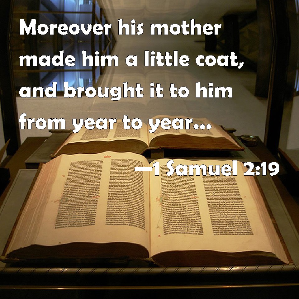 Choose a Background 1 Samuel 2:19 Moreover his mother made him a little coat, and brought it to him from year to year, when she came up with her husband to offer the yearly sacrifice. KJV: Moreover his mother made him a little coat, and brought it to him from year to year, when she came up with her husband to offer the yearly sacrifice. DRB: And his mother made him a little coat, which she brought to him on the appointed days, when she went up with her husband, to offer the solemn sacrifice. DBT: And his mother made him a little coat, and brought it to him from year to year, when she came up with her husband to sacrifice the yearly sacrifice. ERV: Moreover his mother made him a little robe, and brought it to him from year to year, when she came up with her husband to offer the yearly sacrifice. WBT: Moreover his mother made him a little coat, and brought it to him from year to year, when she came up with her husband, to offer the yearly sacrifice. WEB: Moreover his mother made him a little robe, and brought it to him from year to year, when she came up with her husband to offer the yearly sacrifice. YLT: and a small upper coat doth his mother make to him, and she hath brought it up to him from time to time, in her coming up with her husband to sacrifice the sacrifice of the time.Links 1 Samuel 2:19 NIV • 1 Samuel 2:19 NLT • 1 Samuel 2:19 ESV • 1 Samuel 2:19 NASB • 1 Samuel 2:19 KJV • 1 Samuel 2:19 Interlinear • 1 Samuel 2:19 Commentaries • 1 Samuel 2:19 Parallel Texts • 1 Samuel 2:19 Bible Apps • 1 Samuel 2:19 Parallel • Bible Hub |