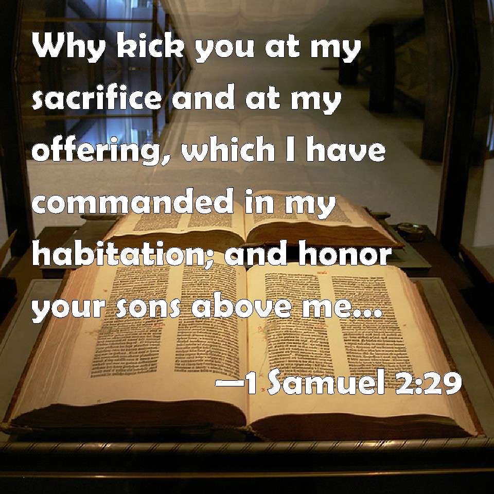 Choose a Background 1 Samuel 2:29 Why kick you at my sacrifice and at my offering, which I have commanded in my habitation; and honor your sons above me, to make yourselves fat with the most chief of all the offerings of Israel my people? KJV: Wherefore kick ye at my sacrifice and at mine offering, which I have commanded in my habitation; and honourest thy sons above me, to make yourselves fat with the chiefest of all the offerings of Israel my people? DRB: Why have you kicked away my victims, and my gifts which I commanded to be offered in the temple: and thou hast rather honoured thy sons than me, to eat the firstfruits of every sacrifice of my people Israel? DBT: Wherefore do ye trample upon my sacrifice and upon mine oblation which I have commanded in my habitation? And thou honourest thy sons above me, to make yourselves fat with the primest of all the oblations of Israel my people. ERV: Wherefore kick ye at my sacrifice and at mine offering, which I have commanded in my habitation; and honourest thy sons above me, to make yourselves fat with the chiefest of all the offerings of Israel my people? WBT: Wherefore kick ye at my sacrifice and at my offering, which I have commanded in my habitation; and honorest thy sons above me, to make yourselves fat with the chiefest of all the offerings of Israel my people? WEB: Why do you kick at my sacrifice and at my offering, which I have commanded in [my] habitation, and honor your sons above me, to make yourselves fat with the best of all the offerings of Israel my people?' YLT: Why do ye kick at My sacrifice, and at Mine offering which I commanded in My habitation, and dost honour thy sons above Me, to make yourselves fat from the first part of every offering of Israel, of My people?Links 1 Samuel 2:29 NIV • 1 Samuel 2:29 NLT • 1 Samuel 2:29 ESV • 1 Samuel 2:29 NASB • 1 Samuel 2:29 KJV • 1 Samuel 2:29 Interlinear • 1 Samuel 2:29 Commentaries • 1 Samuel 2:29 Parallel Texts • 1 Samuel 2:29 Bible Apps • 1 Samuel 2:29 Parallel • Bible Hub |