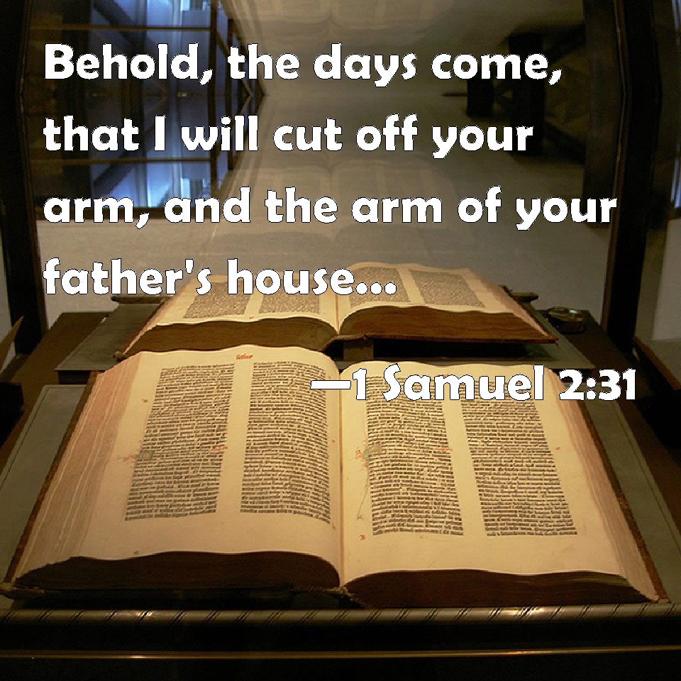 Choose a Background 1 Samuel 2:31 Behold, the days come, that I will cut off your arm, and the arm of your father's house, that there shall not be an old man in your house. KJV: Behold, the days come, that I will cut off thine arm, and the arm of thy father's house, that there shall not be an old man in thine house. DRB: Behold the days come: and I will cut off thy arm, and the arm of thy father's house, that there shall not be an old man in thy house. DBT: Behold, days come, that I will cut off thine arm, and the arm of thy father's house, that there shall not be an old man in thy house. ERV: Behold, the days come, that I will cut off thine arm, and the arm of thy father's house, that there shall not be an old man in thine house. WBT: Behold, the days come, that I will cut off thy arm, and the arm of thy father's house, that there shall not be an old man in thy house. WEB: Behold, the days come, that I will cut off your arm, and the arm of your father's house, that there shall not be an old man in your house. YLT: Lo, days are coming, and I have cut off thine arm, and the arm of the house of thy father, that an old man is not in thy house;Links 1 Samuel 2:31 NIV • 1 Samuel 2:31 NLT • 1 Samuel 2:31 ESV • 1 Samuel 2:31 NASB • 1 Samuel 2:31 KJV • 1 Samuel 2:31 Interlinear • 1 Samuel 2:31 Commentaries • 1 Samuel 2:31 Parallel Texts • 1 Samuel 2:31 Bible Apps • 1 Samuel 2:31 Parallel • Bible Hub |