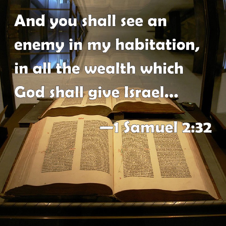 Choose a Background 1 Samuel 2:32 And you shall see an enemy in my habitation, in all the wealth which God shall give Israel: and there shall not be an old man in your house for ever. KJV: And thou shalt see an enemy in my habitation, in all the wealth which God shall give Israel: and there shall not be an old man in thine house for ever. DRB: And thou shalt see thy rival in the temple, in all the prosperity of Israel, and there shall not be an old man in thy house for ever. DBT: And thou shalt see an oppressor in my habitation, amidst all the good that shall be done to Israel; and there shall not be an old man in thy house for ever. ERV: And thou shalt behold the affliction of my habitation, in all the wealth which God shall give Israel: and there shall not be an old man in thine house for ever. WBT: And thou shalt see an enemy in my habitation, in all the wealth which God shall give Israel: and there shall not be an old man in thy house for ever. WEB: You shall see the affliction of [my] habitation, in all the wealth which [God] shall give Israel; and there shall not be an old man in your house forever. YLT: and thou hast beheld an adversary in My habitation, in all that He doth good with Israel, and there is not an old man in thy house all the days.Links 1 Samuel 2:32 NIV • 1 Samuel 2:32 NLT • 1 Samuel 2:32 ESV • 1 Samuel 2:32 NASB • 1 Samuel 2:32 KJV • 1 Samuel 2:32 Interlinear • 1 Samuel 2:32 Commentaries • 1 Samuel 2:32 Parallel Texts • 1 Samuel 2:32 Bible Apps • 1 Samuel 2:32 Parallel • Bible Hub |
