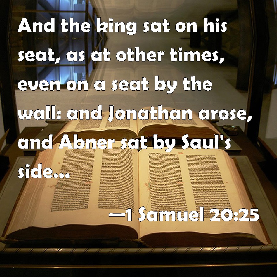 Choose a Background 1 Samuel 20:25 And the king sat on his seat, as at other times, even on a seat by the wall: and Jonathan arose, and Abner sat by Saul's side, and David's place was empty. KJV: And the king sat upon his seat, as at other times, even upon a seat by the wall: and Jonathan arose, and Abner sat by Saul's side, and David's place was empty. DRB: And when the king sat down upon his chair (according to custom) which was beside the wall, Jonathan arose, and Abner sat by Saul's side, and David's place appeared empty. DBT: And the king sat on his seat, as at other times, on the seat by the wall; and Jonathan arose, and Abner sat by Saul's side, and David's place was empty. ERV: And the king sat upon his seat, as at other times, even upon the seat by the wall; and Jonathan stood up, and Abner sat by Saul's side: but David's place was empty. WBT: And the king sat upon his seat, as at other times, even upon a seat by the wall: and Jonathan arose, and Abner sat by Saul's side, and David's place was empty. WEB: The king sat on his seat, as at other times, even on the seat by the wall; and Jonathan stood up, and Abner sat by Saul's side: but David's place was empty. YLT: and the king sitteth on his seat, as time by time, on a seat by the wall, and Jonathan riseth, and Abner sitteth at the side of Saul, and David's place is looked after.Links 1 Samuel 20:25 NIV • 1 Samuel 20:25 NLT • 1 Samuel 20:25 ESV • 1 Samuel 20:25 NASB • 1 Samuel 20:25 KJV • 1 Samuel 20:25 Interlinear • 1 Samuel 20:25 Commentaries • 1 Samuel 20:25 Parallel Texts • 1 Samuel 20:25 Bible Apps • 1 Samuel 20:25 Parallel • Bible Hub |