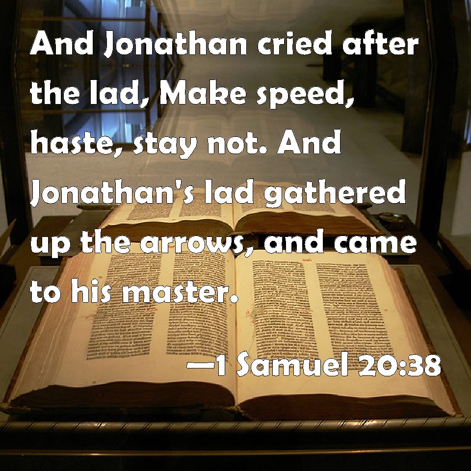 Choose a Background 1 Samuel 20:38 And Jonathan cried after the lad, Make speed, haste, stay not. And Jonathan's lad gathered up the arrows, and came to his master. KJV: And Jonathan cried after the lad, Make speed, haste, stay not. And Jonathan's lad gathered up the arrows, and came to his master. DRB: And Jonathan cried again after the boy, saying: Make haste speedily, stand not. And Jonathan's boy gathered up the arrows, and brought them to his master: DBT: And Jonathan cried after the lad, Make speed, haste, stay not! And Jonathan's lad gathered up the arrows, and came to his master. ERV: And Jonathan cried after the lad, Make speed, haste, stay not. And Jonathan's lad gathered up the arrows, and came to his master. WBT: And Jonathan cried after the lad, Make speed, haste, stay not. And Jonathan's lad gathered up the arrows, and came to his master. WEB: Jonathan cried after the boy, "Go fast! Hurry! Don't delay!" Jonathan's boy gathered up the arrows, and came to his master. YLT: and Jonathan calleth after the youth, 'Speed, haste, stand not;' and Jonathan's youth gathereth the arrows, and cometh unto his lord.Links 1 Samuel 20:38 NIV • 1 Samuel 20:38 NLT • 1 Samuel 20:38 ESV • 1 Samuel 20:38 NASB • 1 Samuel 20:38 KJV • 1 Samuel 20:38 Interlinear • 1 Samuel 20:38 Commentaries • 1 Samuel 20:38 Parallel Texts • 1 Samuel 20:38 Bible Apps • 1 Samuel 20:38 Parallel • Bible Hub |