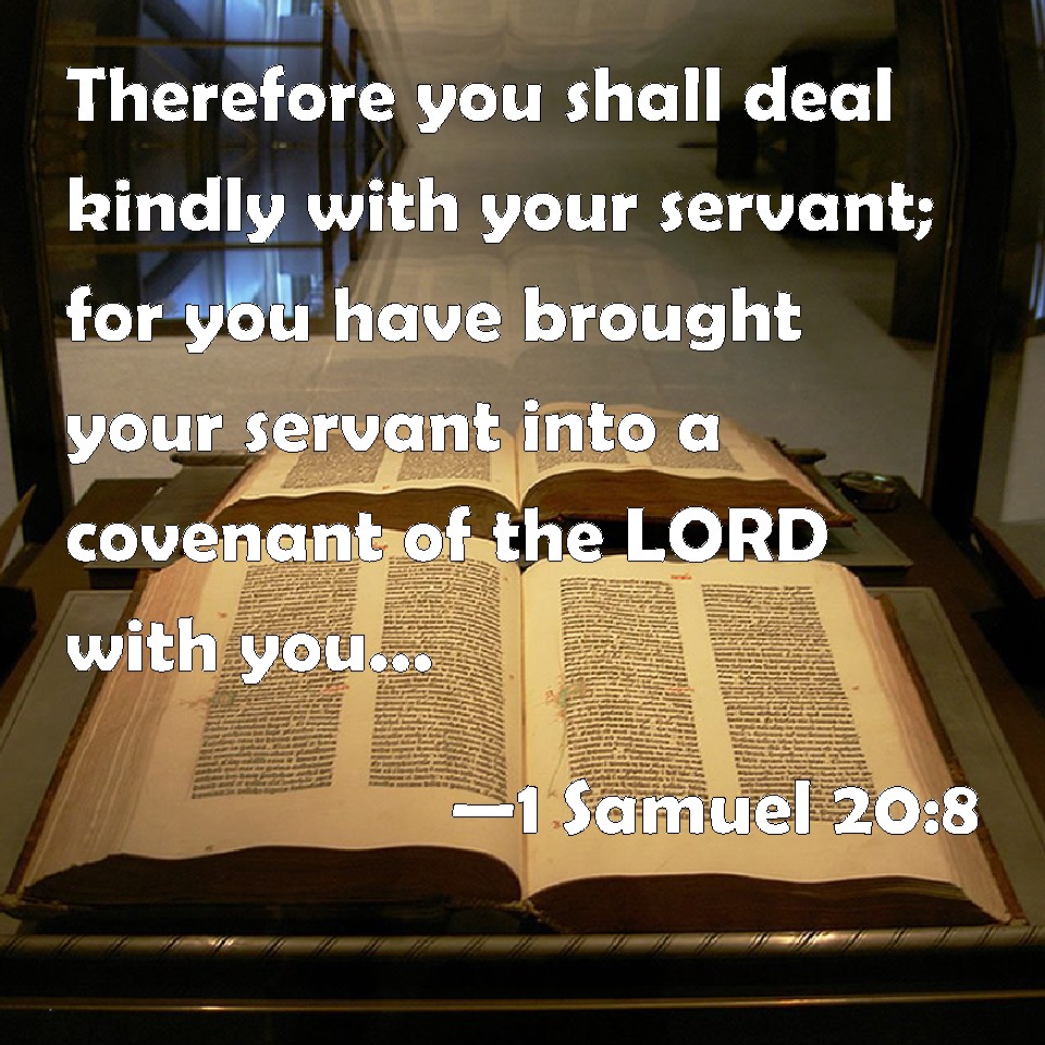 Choose a Background 1 Samuel 20:8 Therefore you shall deal kindly with your servant; for you have brought your servant into a covenant of the LORD with you: notwithstanding, if there be in me iniquity, slay me yourself; for why should you bring me to your father? KJV: Therefore thou shalt deal kindly with thy servant; for thou hast brought thy servant into a covenant of the LORD with thee: notwithstanding, if there be in me iniquity, slay me thyself; for why shouldest thou bring me to thy father? DRB: Deal mercifully then with thy servant: for thou hast brought me thy servant into a covenant of the Lord with thee. But if there be any iniquity in me, do thou kill me, and bring me not in to thy father. DBT: Deal kindly then with thy servant; for thou hast brought thy servant into a covenant of Jehovah with thee; but if there be in me iniquity, slay me thyself; for why shouldest thou bring me to thy father? ERV: Therefore deal kindly with thy servant; for thou hast brought thy servant into a covenant of the LORD with thee: but if there be in me iniquity, slay me thyself; for why shouldest thou bring me to thy father? WBT: Therefore thou shalt deal kindly with thy servant; for thou hast brought thy servant into a covenant of the LORD with thee: notwithstanding, if there is in me iniquity, slay me thyself; for why shouldst thou bring me to thy father? WEB: Therefore deal kindly with your servant; for you have brought your servant into a covenant of Yahweh with you: but if there be in me iniquity, kill me yourself; for why should you bring me to your father?" YLT: and thou hast done kindness, to thy servant, for into a covenant of Jehovah thou hast brought thy servant with thee; — and if there is in me iniquity, put thou me to death; and unto thy father, why is this — thou dost bring me in?'Links 1 Samuel 20:8 NIV • 1 Samuel 20:8 NLT • 1 Samuel 20:8 ESV • 1 Samuel 20:8 NASB • 1 Samuel 20:8 KJV • 1 Samuel 20:8 Interlinear • 1 Samuel 20:8 Commentaries • 1 Samuel 20:8 Parallel Texts • 1 Samuel 20:8 Bible Apps • 1 Samuel 20:8 Parallel • Bible Hub |
