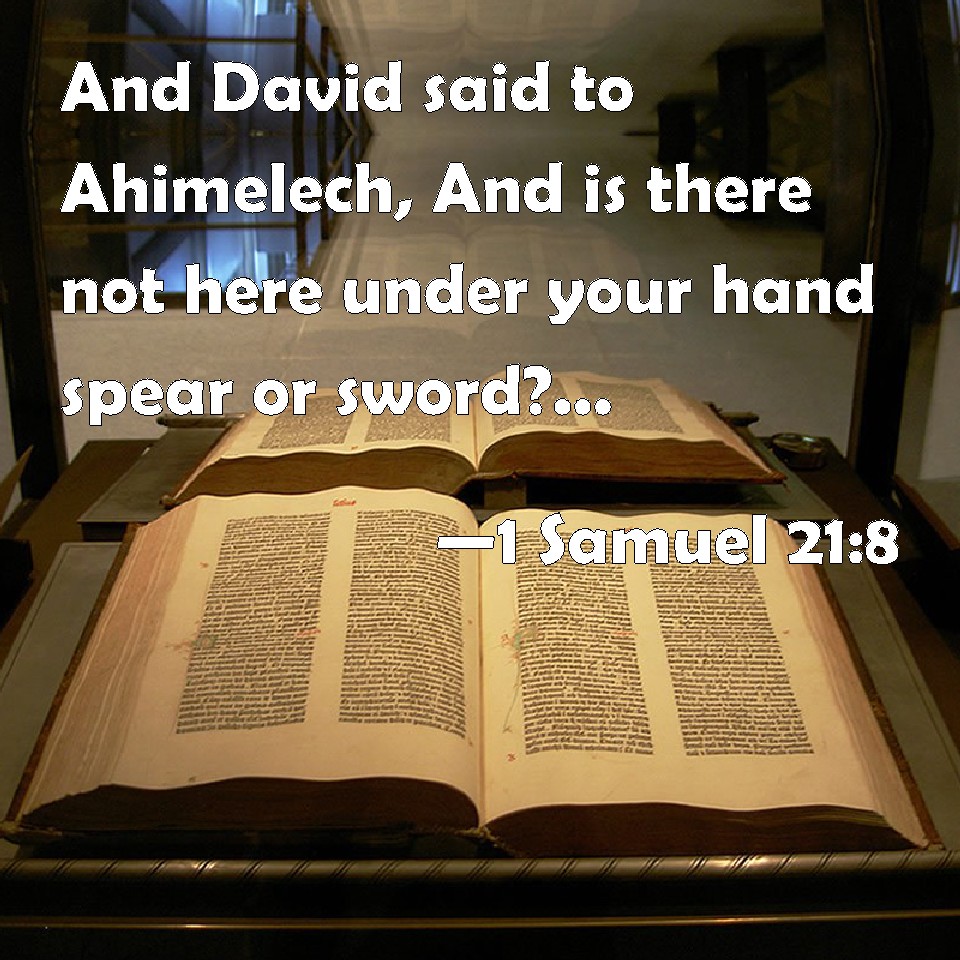 Choose a Background 1 Samuel 21:8 And David said to Ahimelech, And is there not here under your hand spear or sword? for I have neither brought my sword nor my weapons with me, because the king's business required haste. KJV: And David said unto Ahimelech, And is there not here under thine hand spear or sword? for I have neither brought my sword nor my weapons with me, because the king's business required haste. DRB: And David said to Achimelech: Hast thou here at hand a spear, or a sword? for I brought not my own sword, nor my own weapons with me, for the king's business required haste. DBT: And David said to Ahimelech, And is there not here under thy hand spear or sword? for I have neither brought my sword nor my weapons with me, for the king's business was urgent. ERV: And David said unto Ahimelech, And is there not here under thine hand spear or sword? for I have neither brought my sword nor my weapons with me, because the king's business required haste. WBT: And David said to Ahimelech, And is there not here under thy hand a spear or sword? for I have neither brought my sword nor my weapons with me, because the king's business required haste. WEB: David said to Ahimelech, "Isn't there here under your hand spear or sword? For I have neither brought my sword nor my weapons with me, because the king's business required haste." YLT: And David saith to Ahimelech, 'And is there not here under thy hand spear or sword? for neither my sword nor my vessels have I taken in my hand, for the matter of the king was urgent.'Links 1 Samuel 21:8 NIV • 1 Samuel 21:8 NLT • 1 Samuel 21:8 ESV • 1 Samuel 21:8 NASB • 1 Samuel 21:8 KJV • 1 Samuel 21:8 Interlinear • 1 Samuel 21:8 Commentaries • 1 Samuel 21:8 Parallel Texts • 1 Samuel 21:8 Bible Apps • 1 Samuel 21:8 Parallel • Bible Hub |